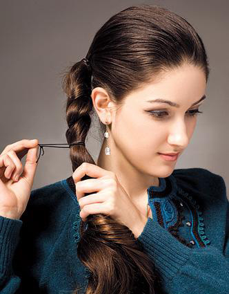step4.将蓬松的马尾发束一分为二,开始进行螺旋交错缠绕至尾端后,并顺势将螺旋状马尾收成发髻。