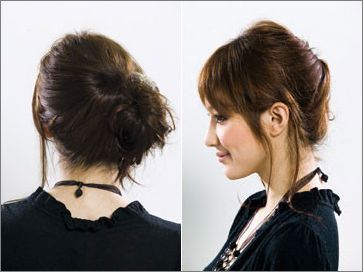 step5.大致固定出发髻雏形后,将发髻中的发丝往四面八方随意拉出并以黑夹固定,营造出活泼发髻造型。