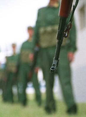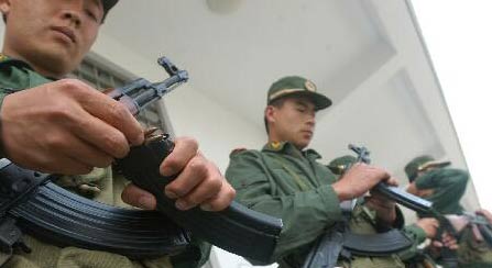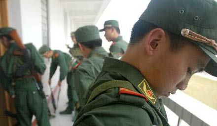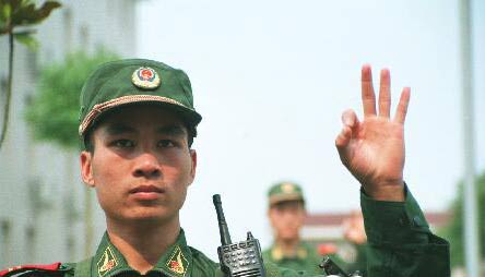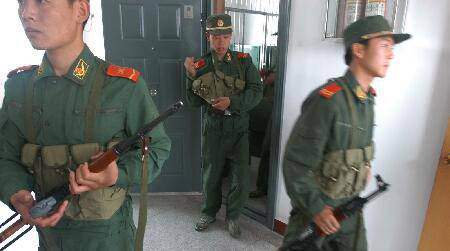 行进途中,在 进 - 入 一个新地界交接时,武警战士戒备森严