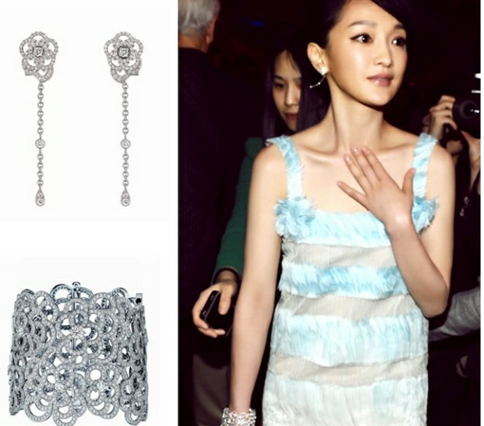 周迅身着CHANEL 2010春夏高级定制服系列蓝色礼服裙,佩戴CHANEL高级珠宝Camelia Dantelle山茶花系列镶钻铐式手镯,以及CHANEL Camelia Brode山茶花系列镶钻耳环出席第六十五届戛纳电影节。