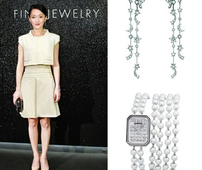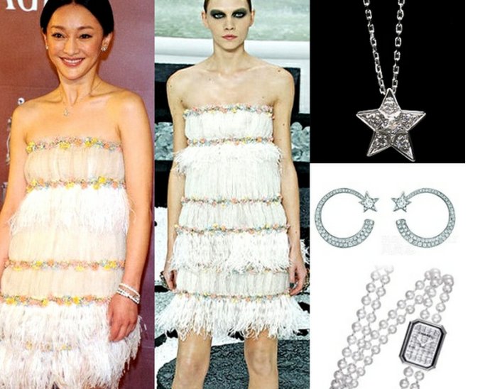 周迅2011年亮相第30届香港金像奖颁奖典礼,身着CHANEL 2011春夏高级成衣系列,佩戴CHANEL高级珠宝和手表。