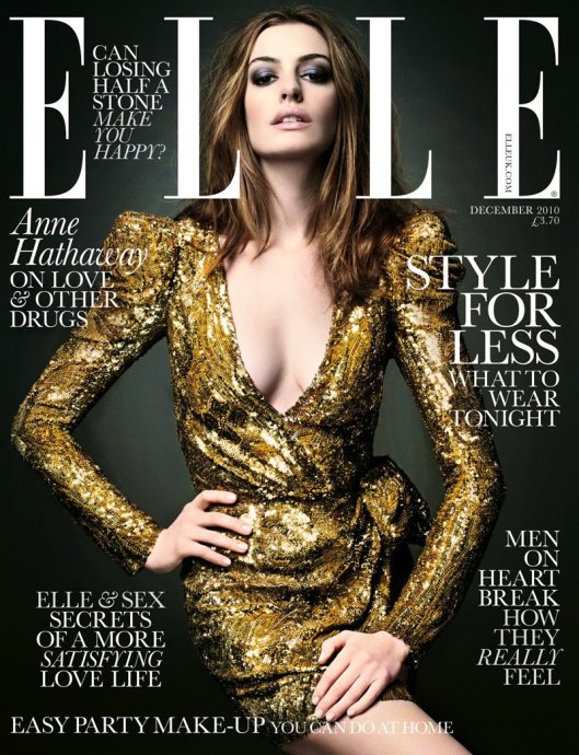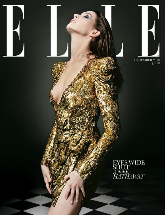Anne Hathaway在《Elle》英国版演绎金色Balmain礼服照
