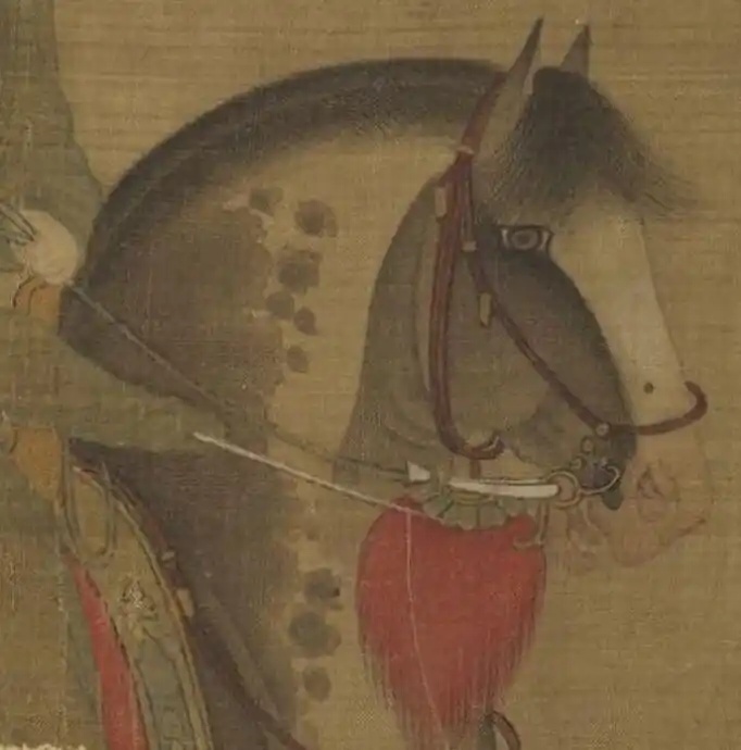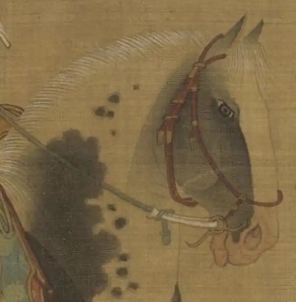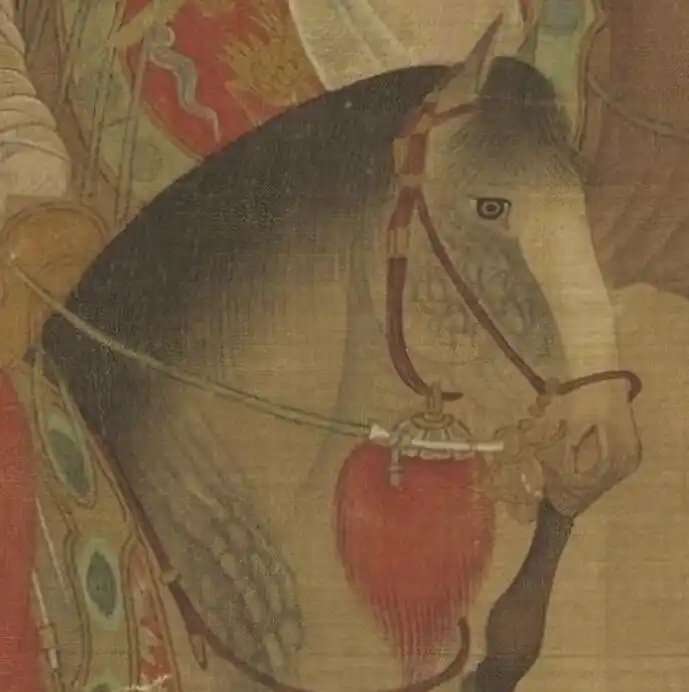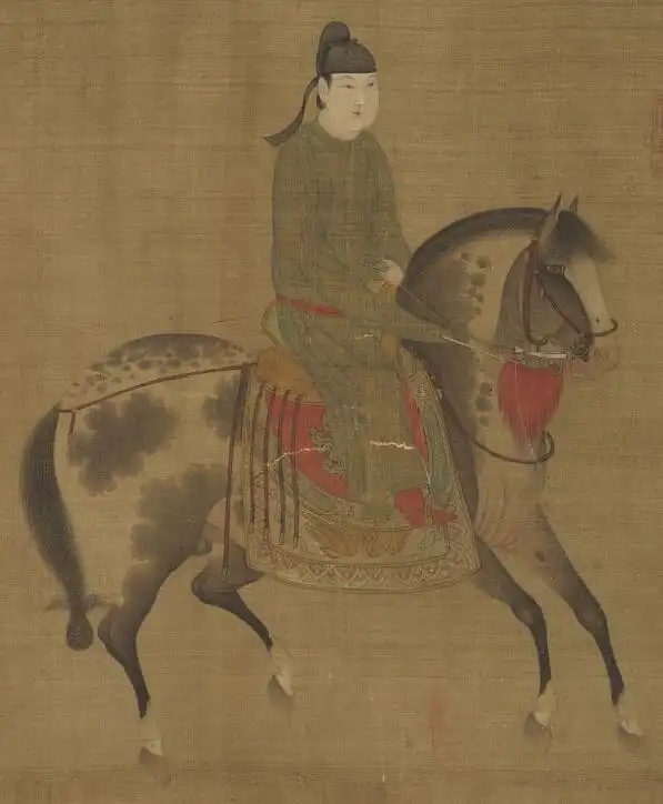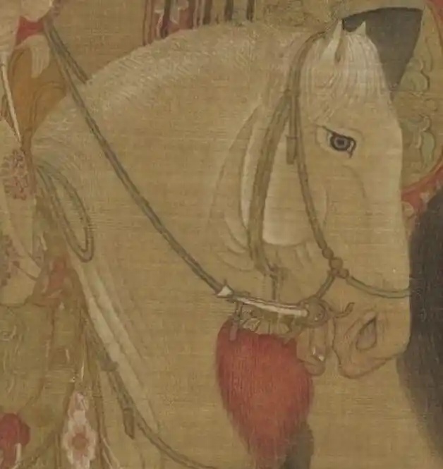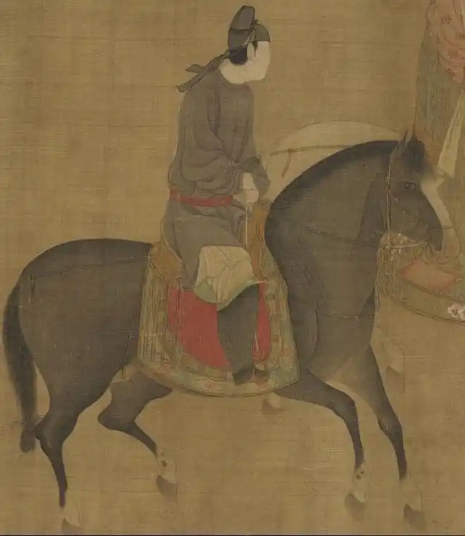 最前面一人,目视前方,骑马引路,涂脂抹粉,脚穿红靴,不知是否为女扮男装。