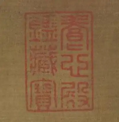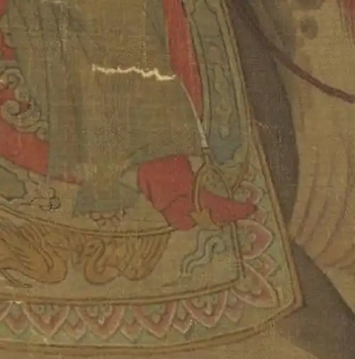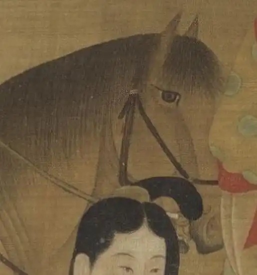 一说:右三为虢国夫人,右二为秦国夫人,抱孩子为韩国夫人。另一说:右一为虢国夫人,右三为秦国夫人,右二为韩国夫人。可谓仁者见仁,智者见智。