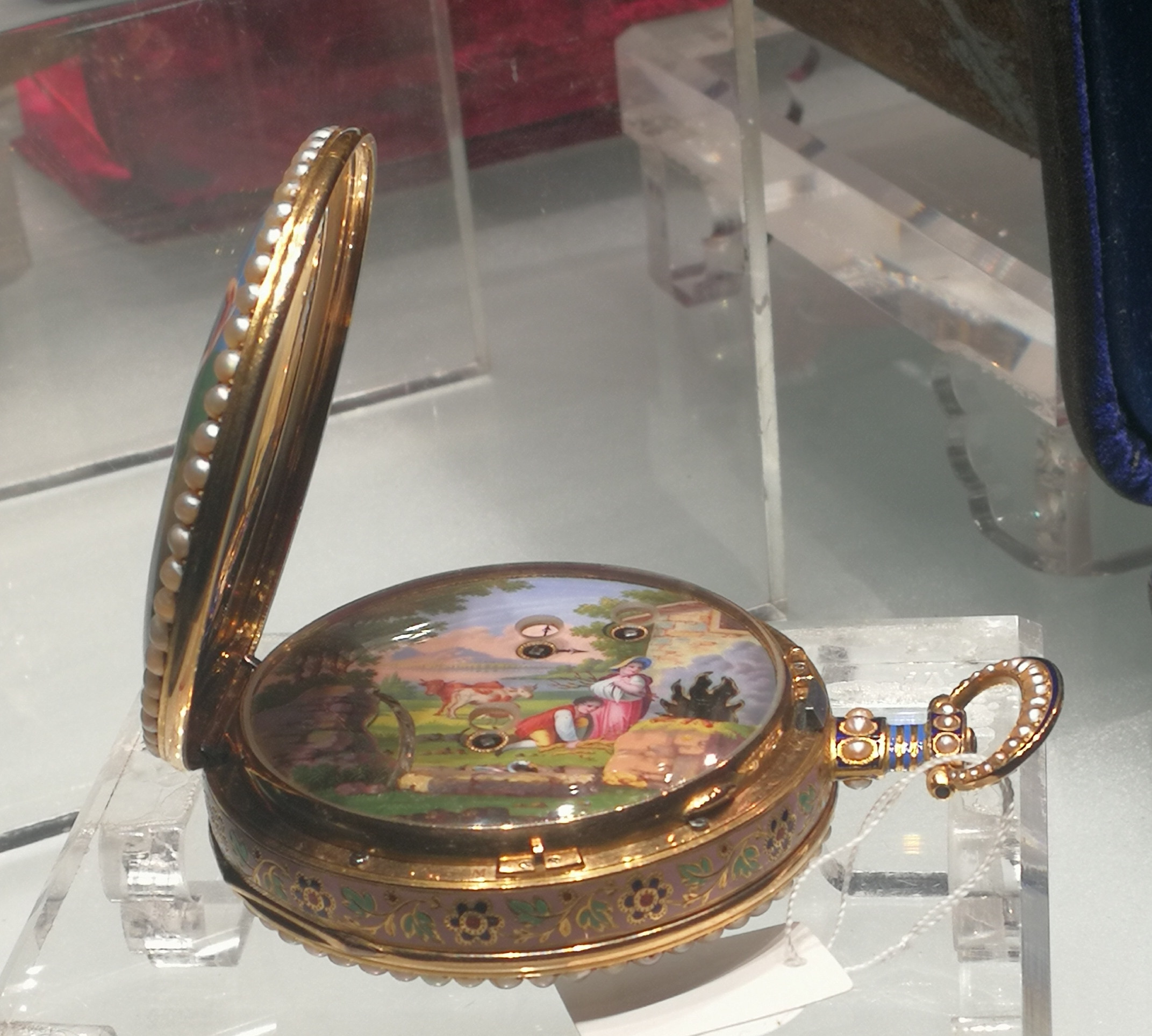 19世纪初(约1815)金胎画多层珐琅动偶嵌珍珠怀表