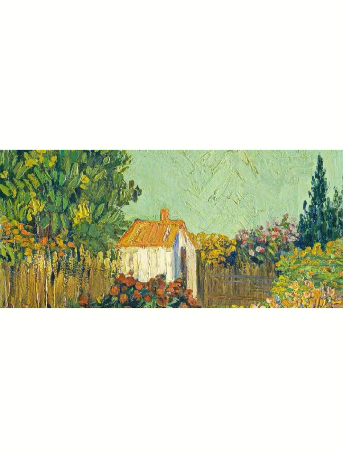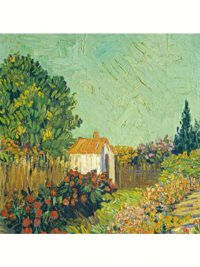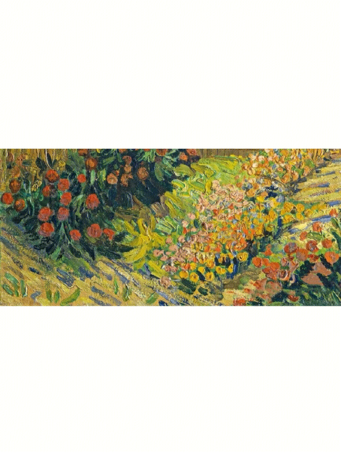 “在蓝天下,一片片橙、黄、红色的花朵显得缤纷灿烂,在清晰的空气中,这里有比北方更加欢乐、更充满爱意的东西……”1888年夏,凡·高从法国南部小城阿尔给弟弟提奥写信。在同一封信中,他提到两件不同的习作,还有一幅阿尔附近的一处花园的素描稿。那年初春,凡·高充满了对海牙画派的回忆。当他得知之前的老师安东·莫夫(Anton Mauve)逝世之后,意识到自己之前在海牙的那段时间对他是多么重要。那期间,安东·莫夫建议他要多多写生。在阿尔,凡·高尽情享受着色彩斑斓的普鲁旺斯风光。但是,在这幅画中,他的用色却与海牙画派画家的敏感细腻截然不同。