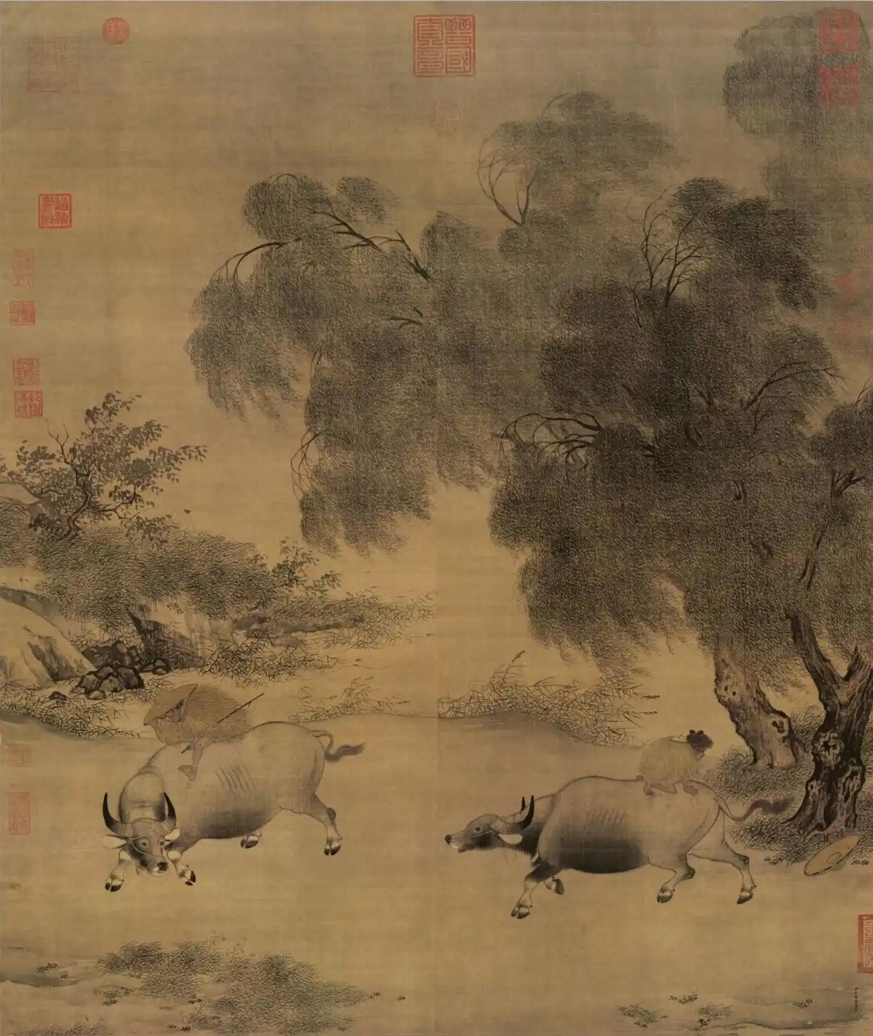 纵观全面,画家笔墨之精妙,设色之雅致,形态之曲肖,令人叹为观止;更妙的是,画者并未直写风雨,而是透过人、牛的动态,草木的形状,以及墨色淡彩的渗化,将风声雨势以及牧童的切切归心表现的真切动人。