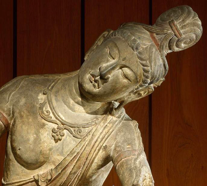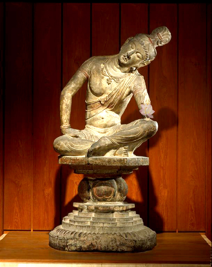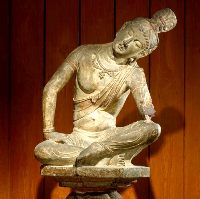 唐代石雕思维菩萨坐像(公元725-750年);菩萨高发髻,五官清秀,神态安详,姿态优雅。斜披圣带,身佩项圈、臂钏、手镯等饰品庄严全身。袒露上身,肌体圆润。下着贴体薄裙,褶纹清晰,较好地表现出丝绸的质感。菩萨盘膝而坐,右手屈肘撑于腿上,左手屈肘上抬,整个上身及头部大幅向左倾斜,双目微合,作思维状。其姿态之优美,神态之恬静,结构之准确,手法之简洁,均达到了高超的水平。思维菩萨像为中国所创,流行于南北朝时期,后代渐少。