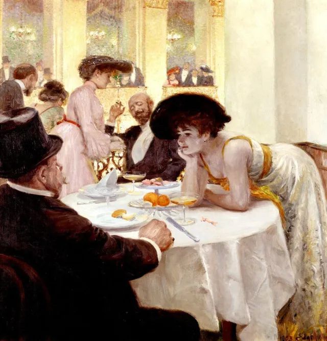 《时尚女性》,那足可以当爷爷的丈夫正在替妻子披上裘皮大衣外套,右边有一位年轻的绅士正在目不转睛地看着这一幕,这样难免会引起观者的联想,是情人,是她包养的小白脸吗?