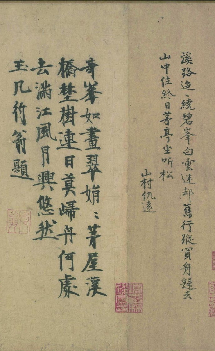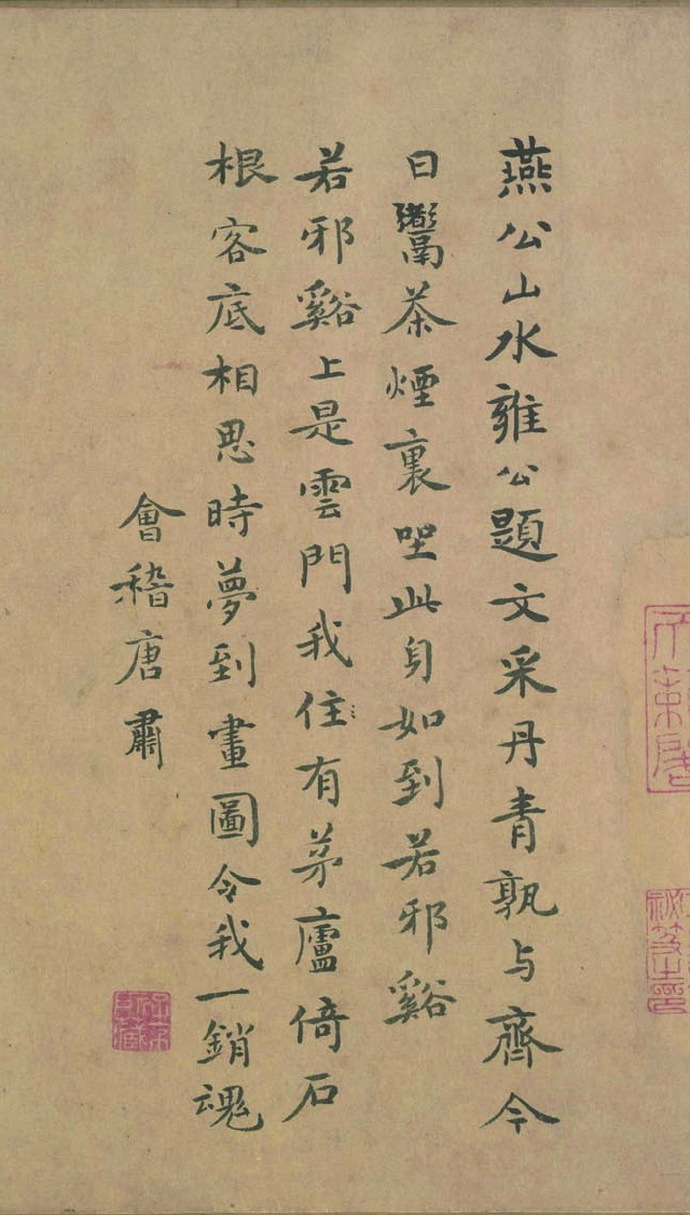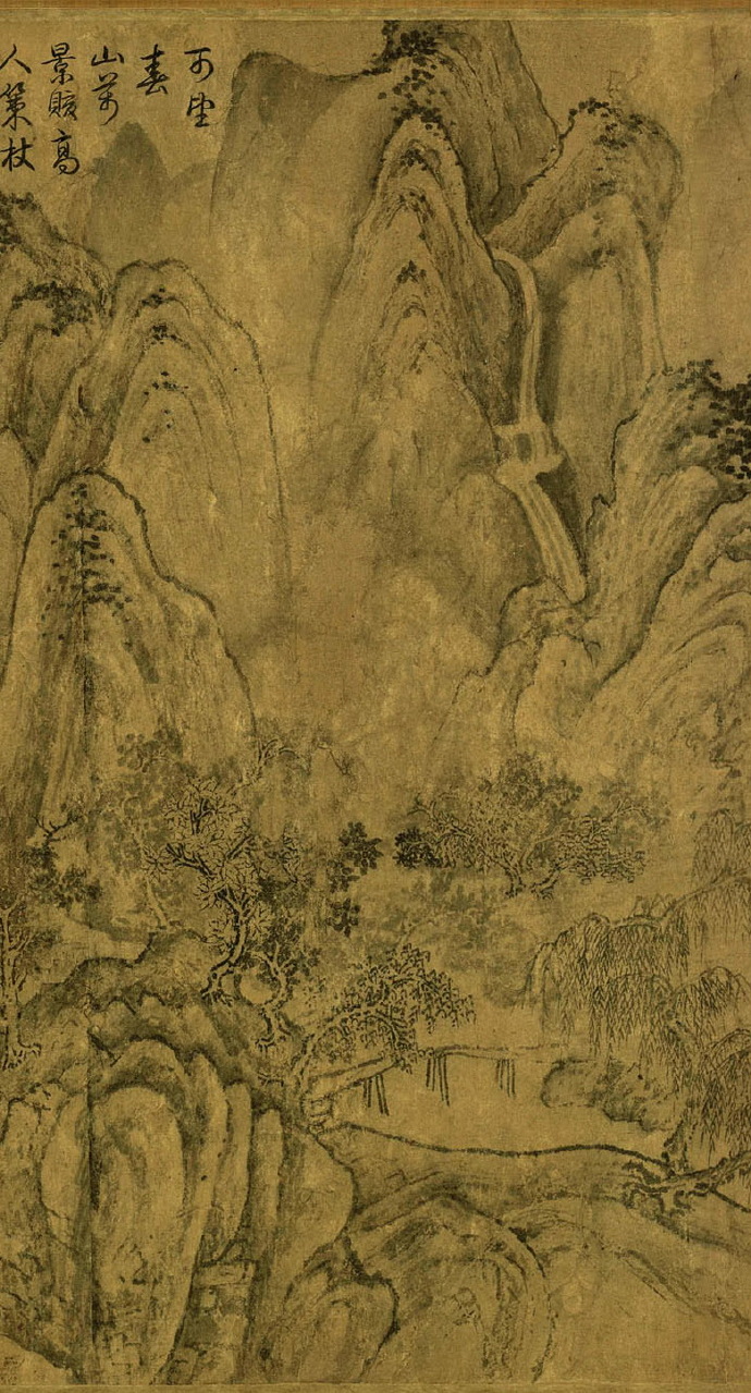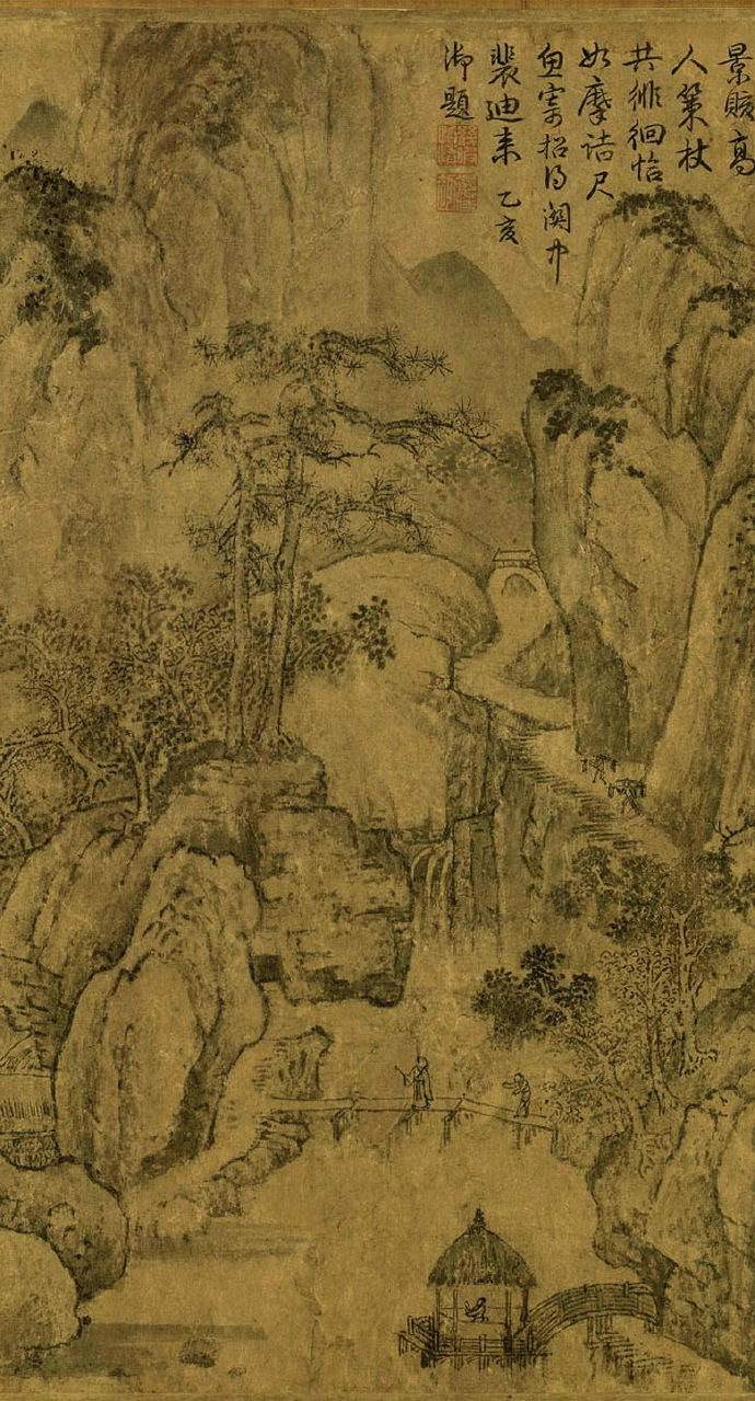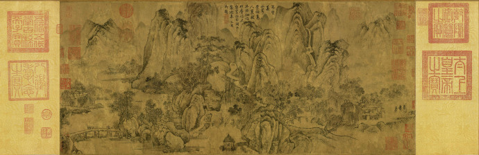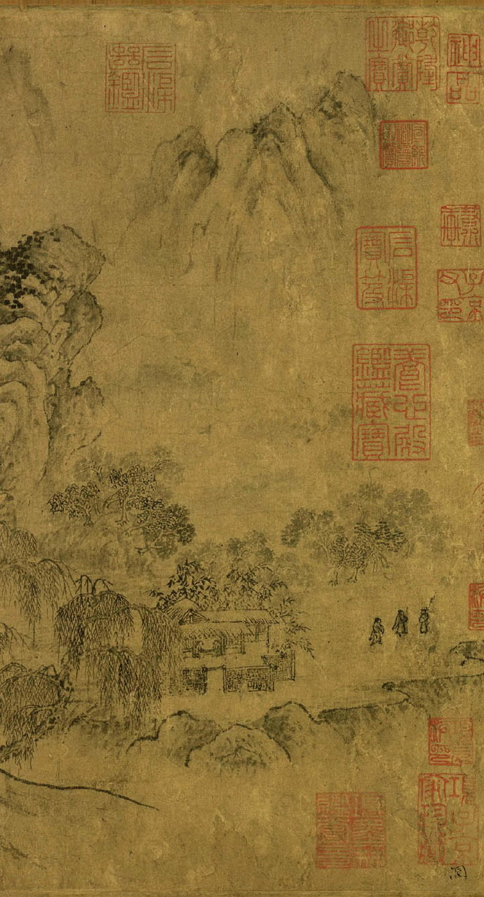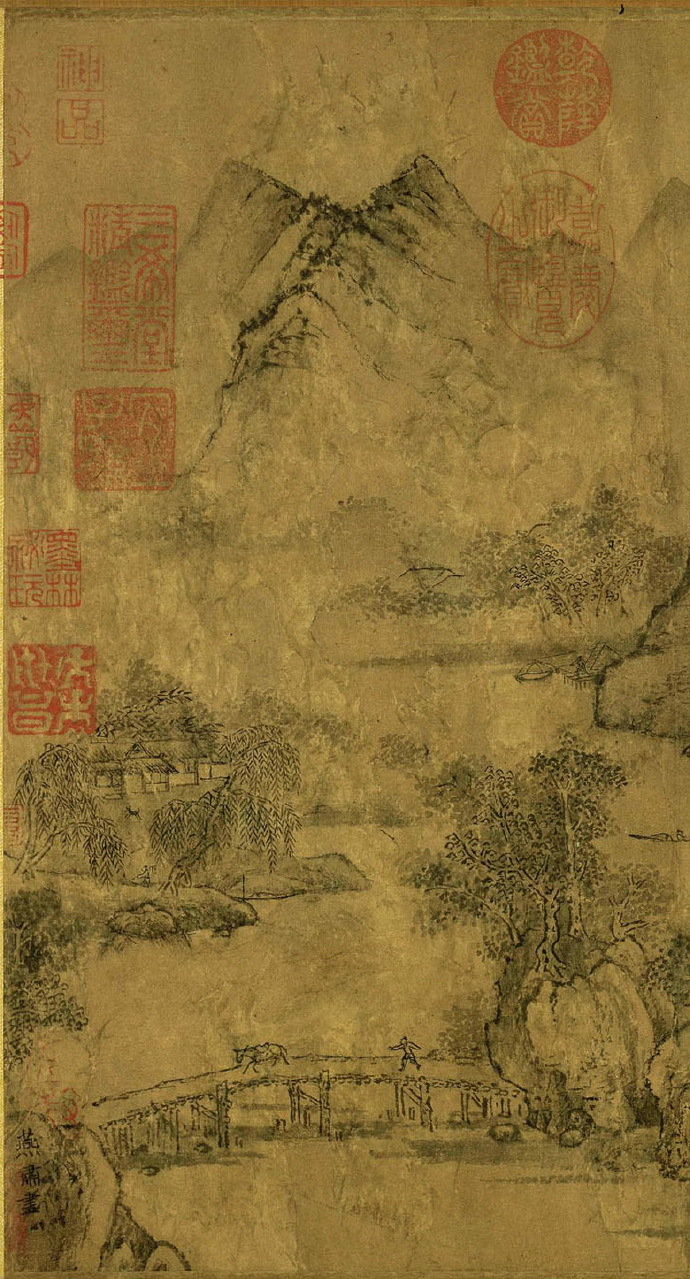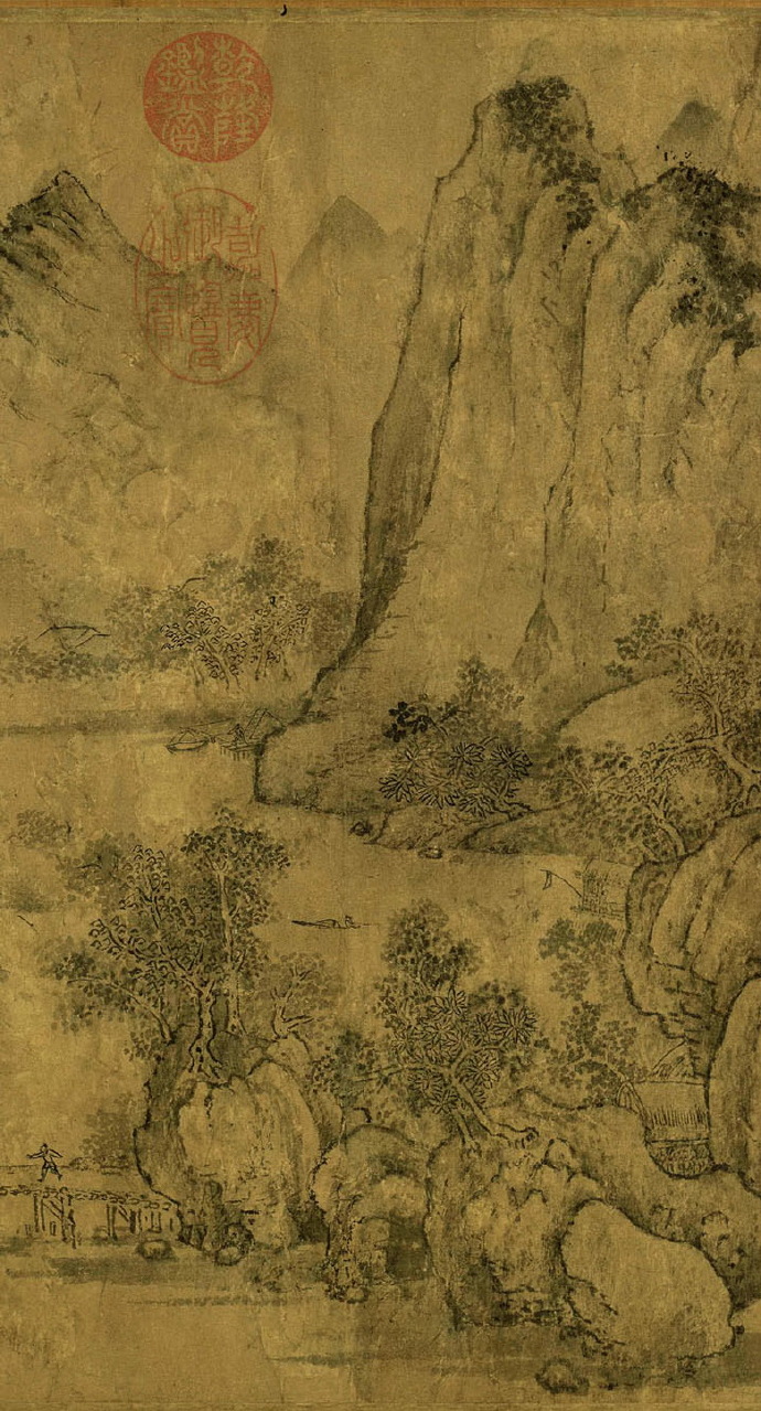 《春山图》宋代燕肃作,紙本墨筆,他長於機械,一生中有很多发明创造,同時他还通音律,能写詩作画,是我国宋代的一位多才多艺的著名科学家。作品中春山聳秀,溪流板橋,竹籬村舍,高松垂柳。在山水中尋幽訪勝的刻畫,流露出画家对林泉之乐的向往。而画中生拙凝重的笔墨和山水造型,与一般的职业画家迥異,帶有早期文人画的形跡。