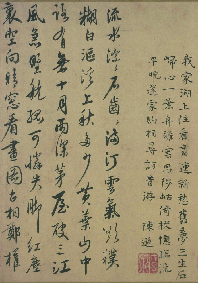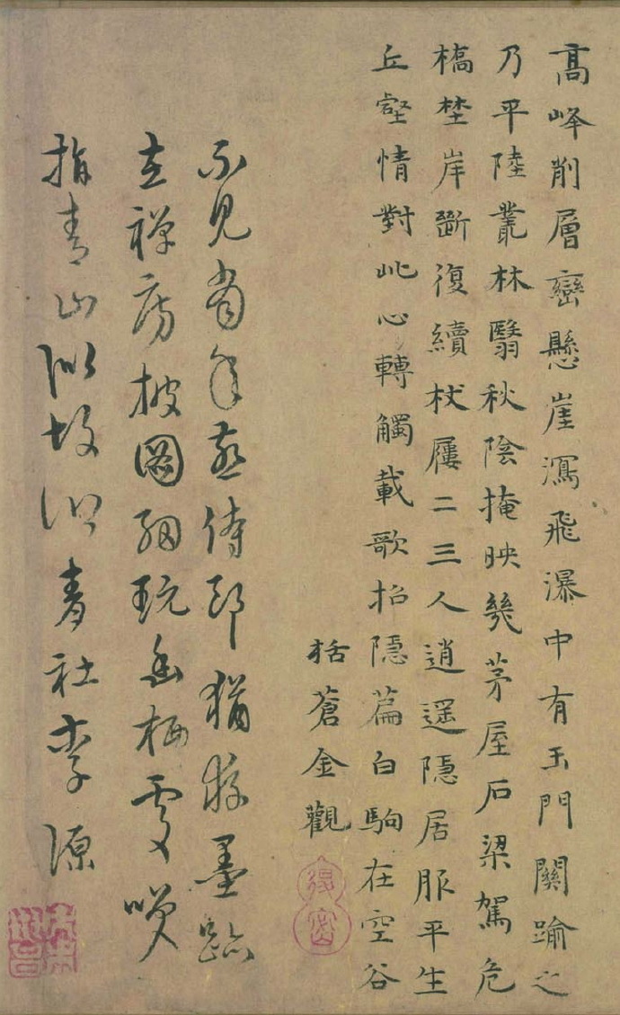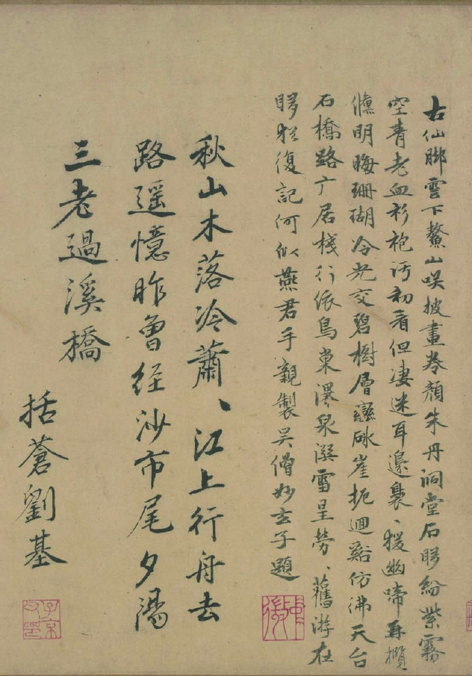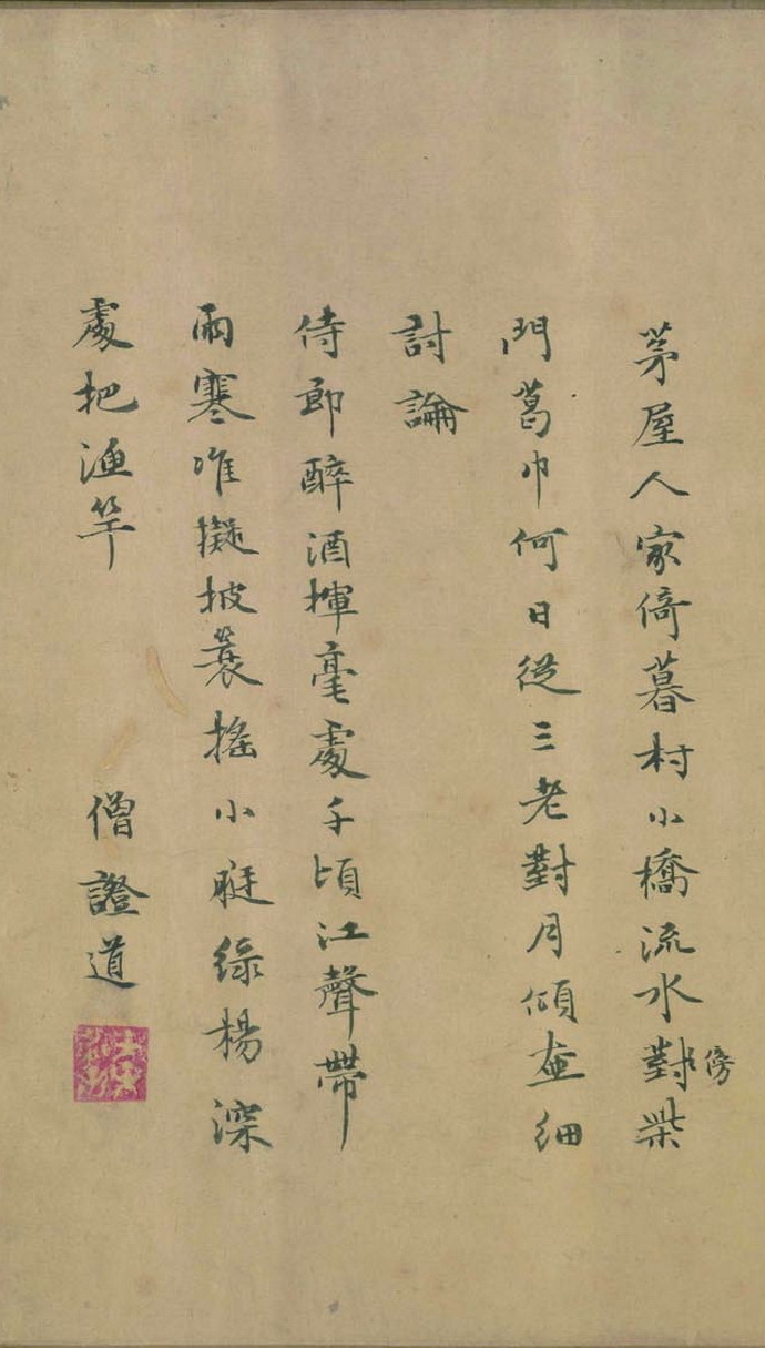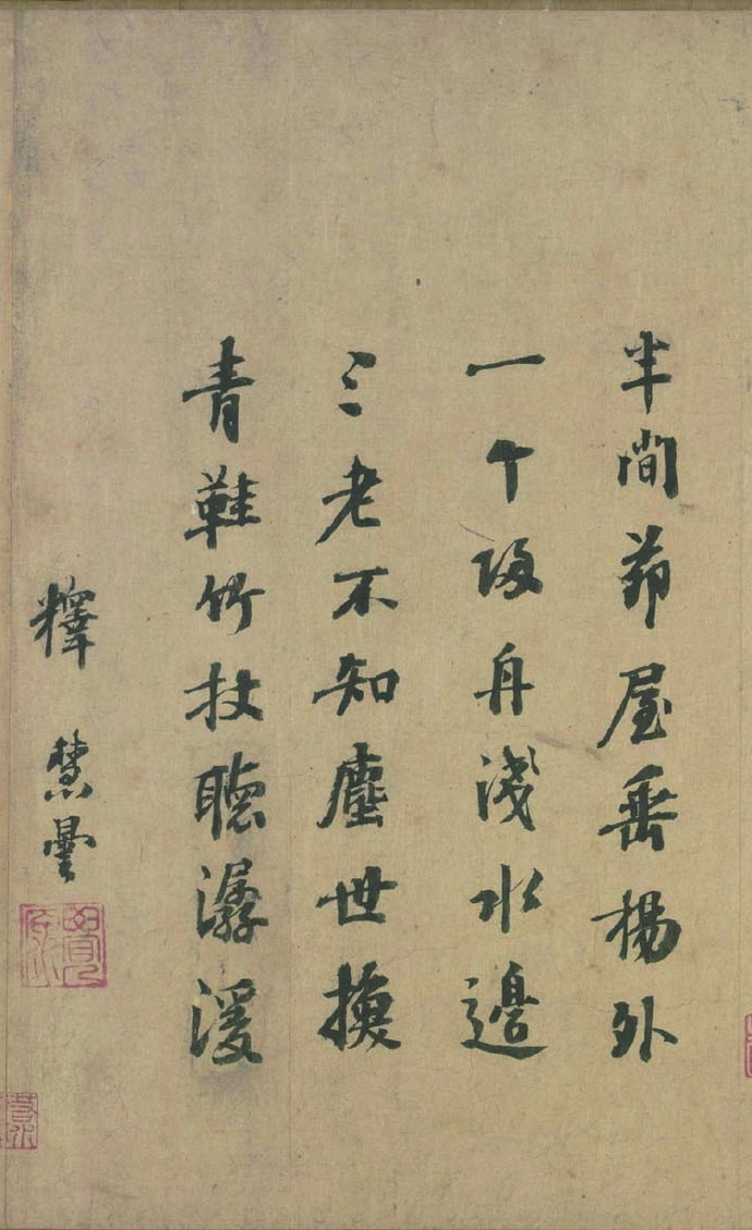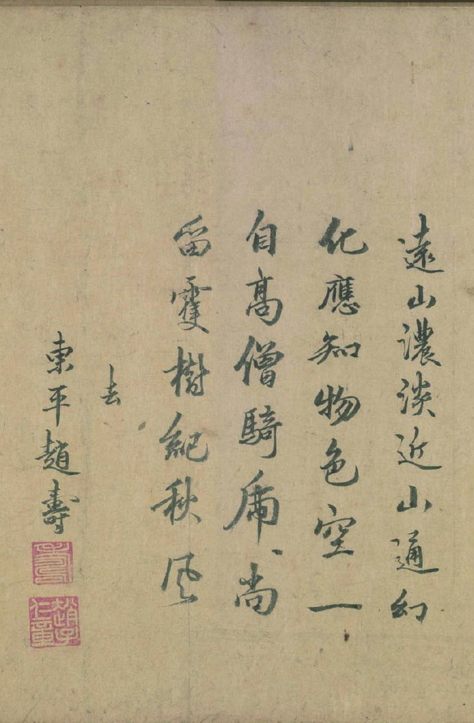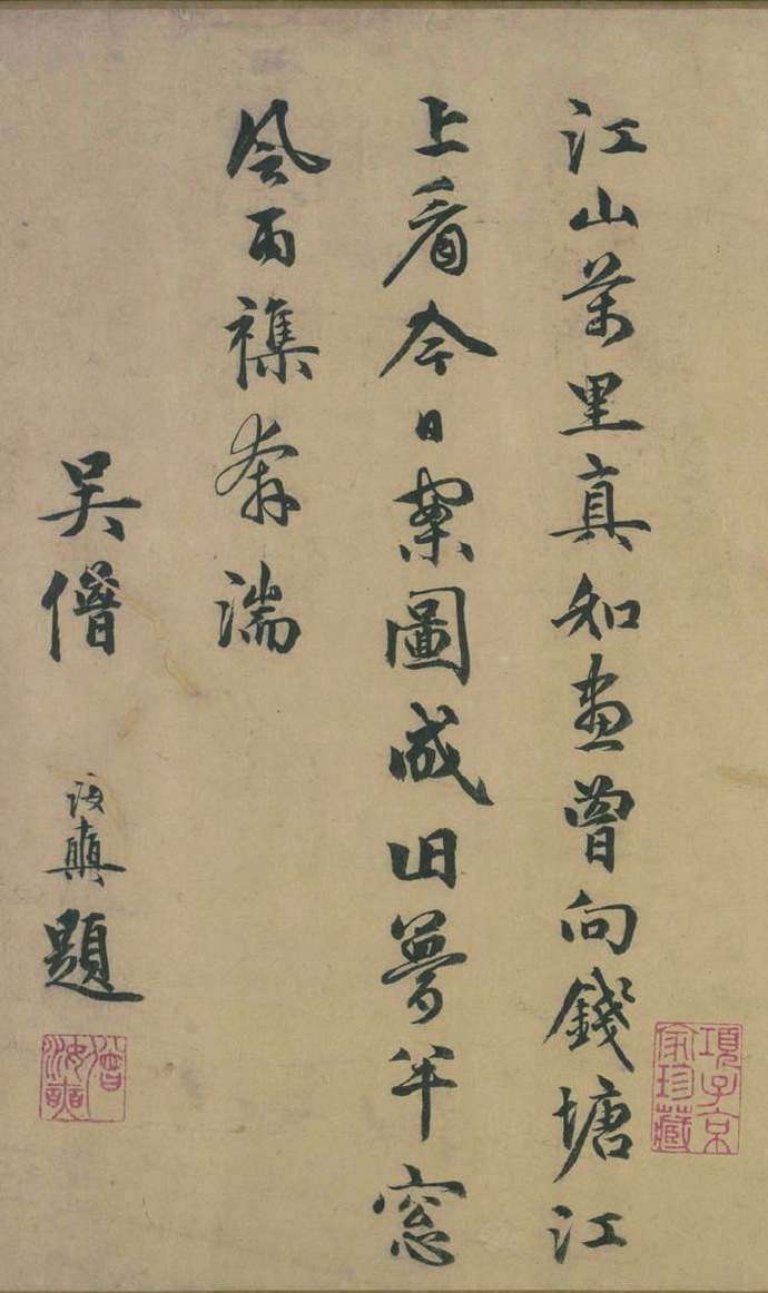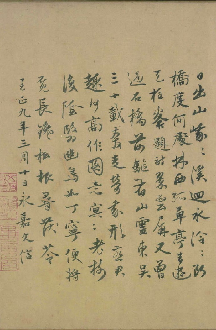 《春山图》宋代燕肃作,紙本墨筆,他長於機械,一生中有很多发明创造,同時他还通音律,能写詩作画,是我国宋代的一位多才多艺的著名科学家。作品中春山聳秀,溪流板橋,竹籬村舍,高松垂柳。在山水中尋幽訪勝的刻畫,流露出画家对林泉之乐的向往。而画中生拙凝重的笔墨和山水造型,与一般的职业画家迥異,帶有早期文人画的形跡。