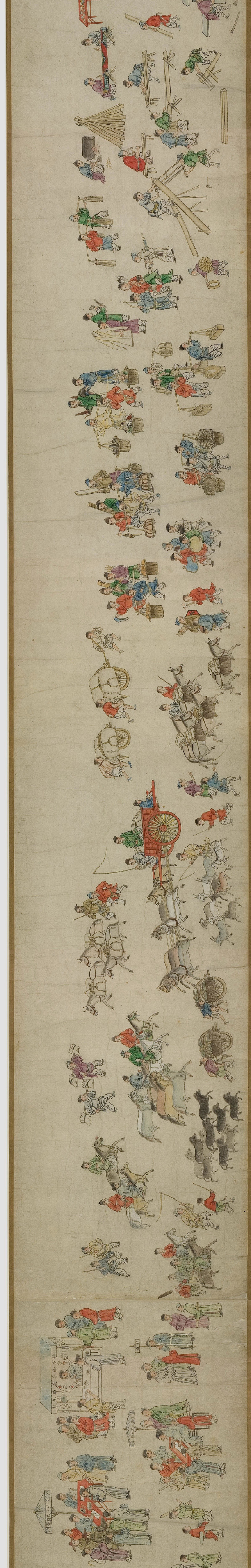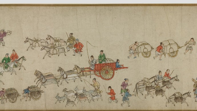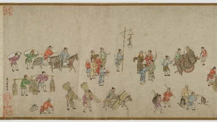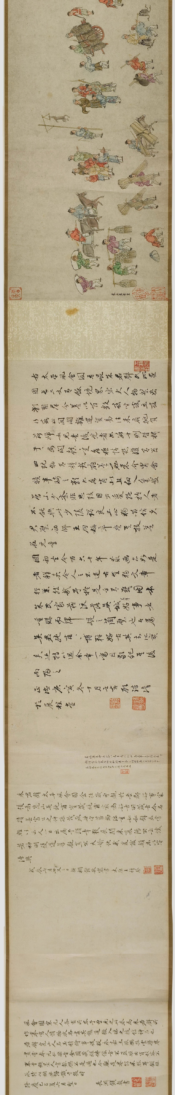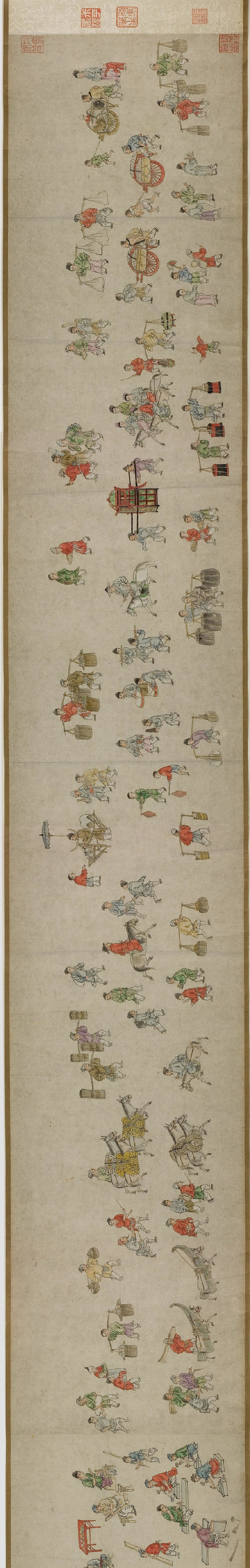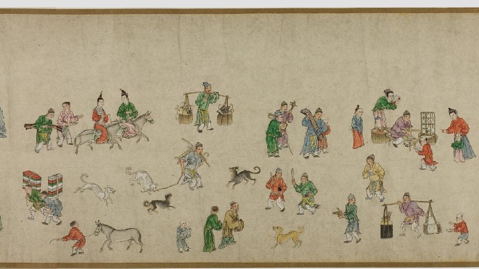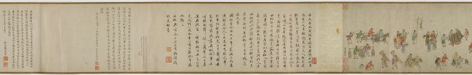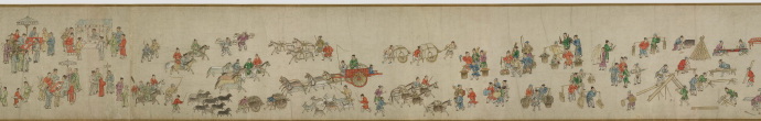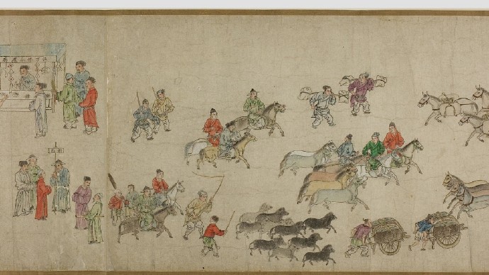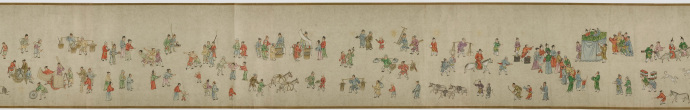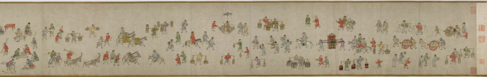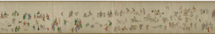 畫卷描繪各種人物約四百七十、牛三頭、馬十匹、騾子四十五匹、羊九隻、豬十頭、狗七條、獼猴、鵝等。根據畫卷內容,此卷繪製時間可能偏明代初期。