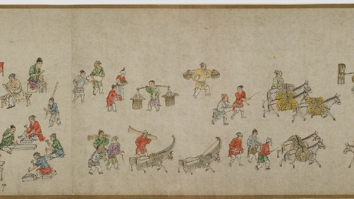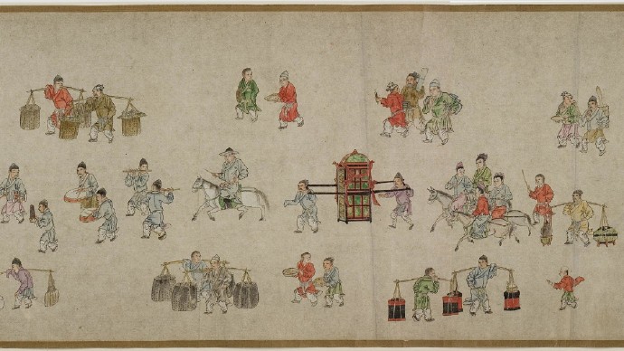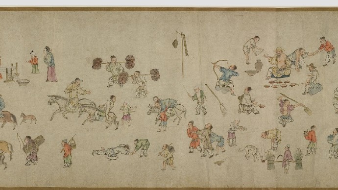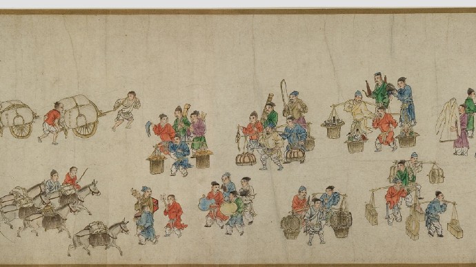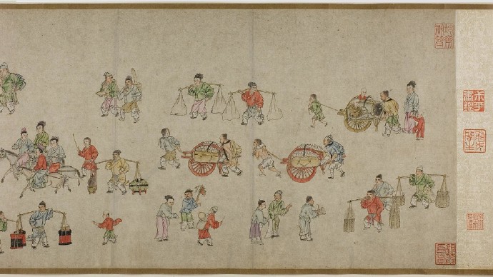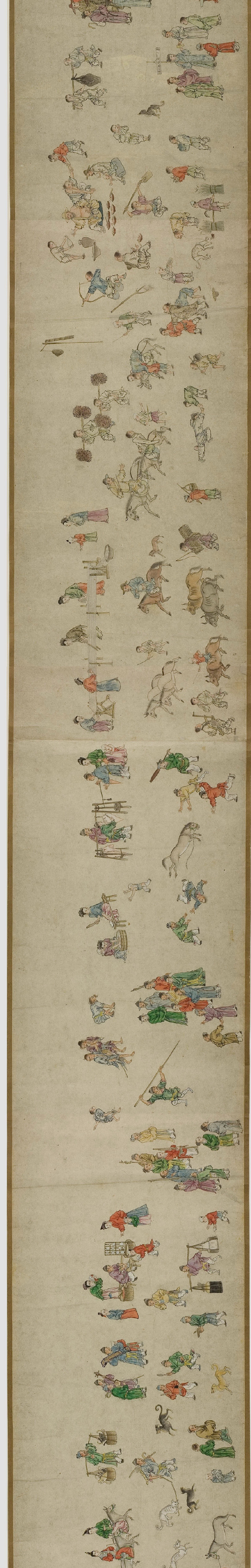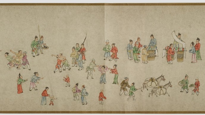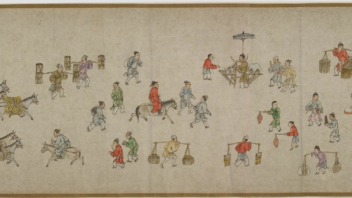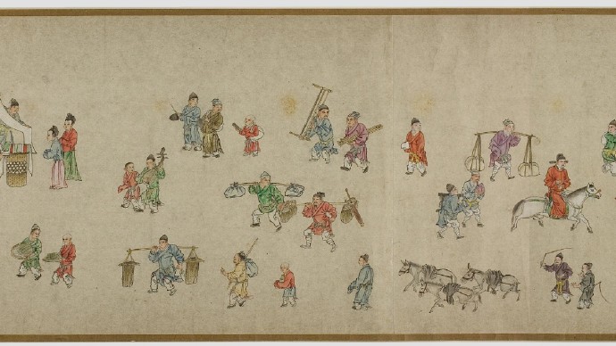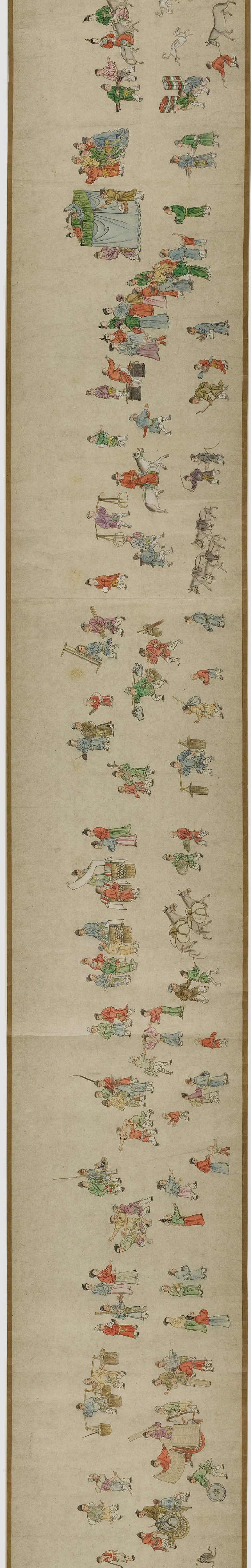 畫卷描繪各種人物約四百七十、牛三頭、馬十匹、騾子四十五匹、羊九隻、豬十頭、狗七條、獼猴、鵝等。根據畫卷內容,此卷繪製時間可能偏明代初期。