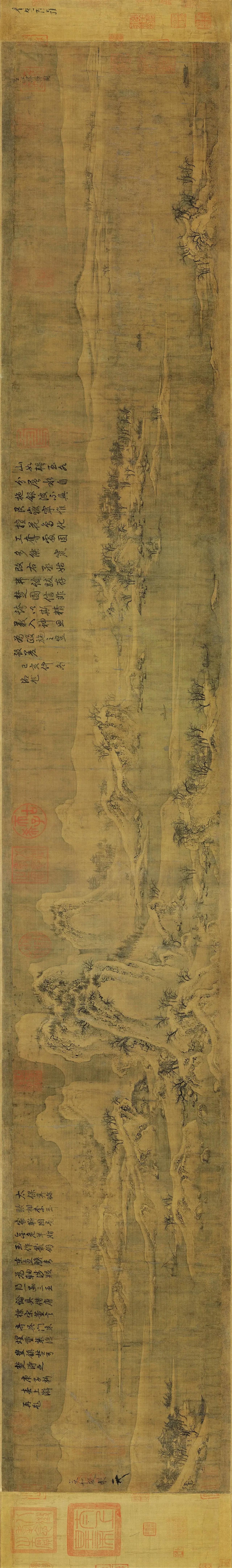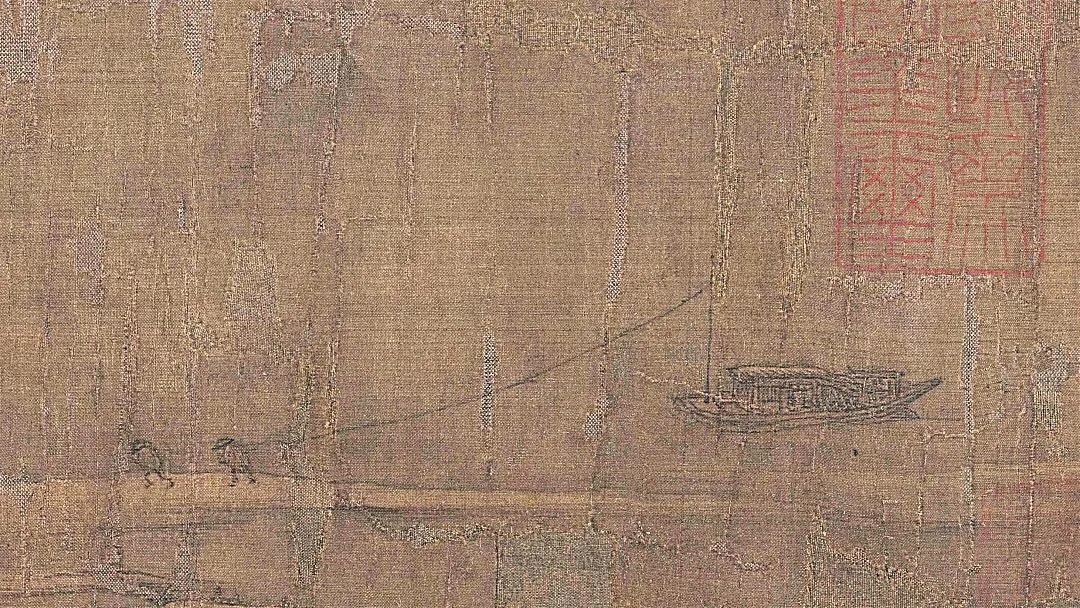 《雪江归棹图》宋徽宗,作品描绘白雪覆盖的冬山在长卷式的绢地上绵延起伏,一道宁静的江流贯穿始终。作品笔法冲逸雅畅,意境荒寒幽远,堪称北宋雪景山水画的代表作。