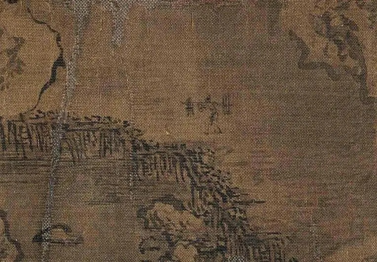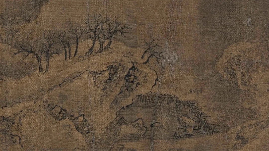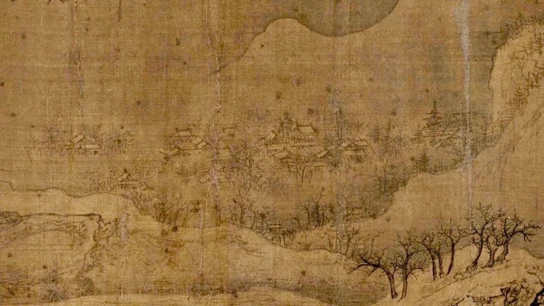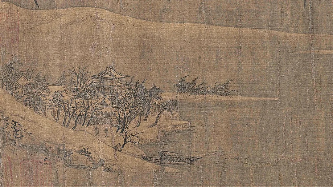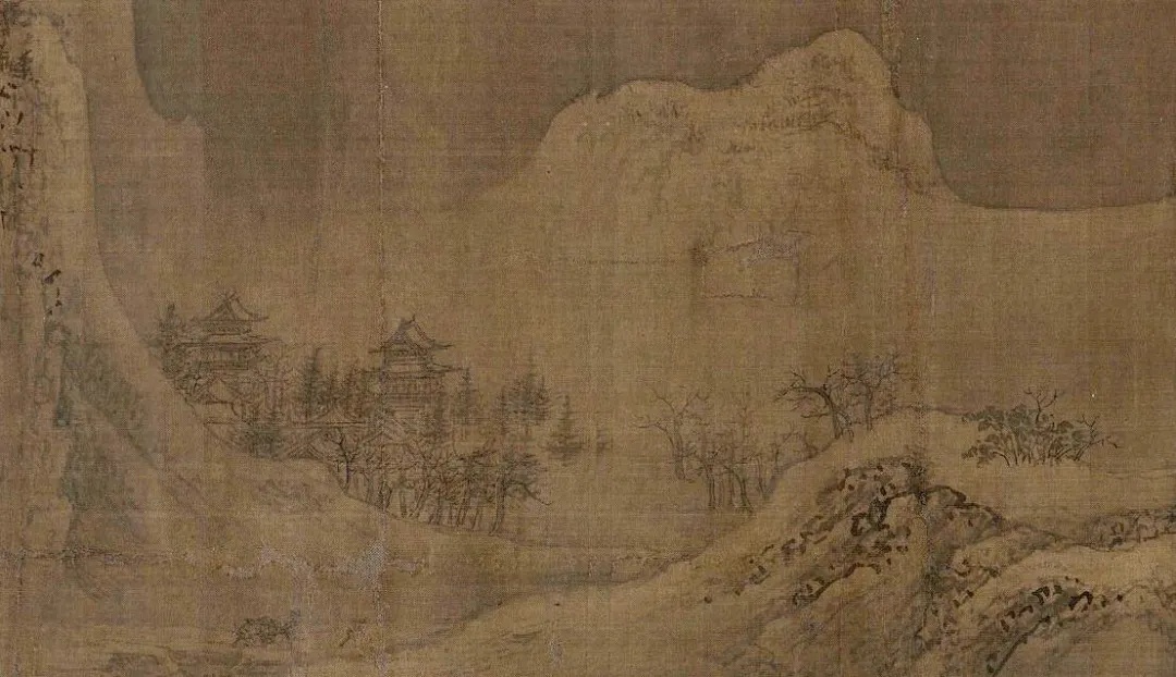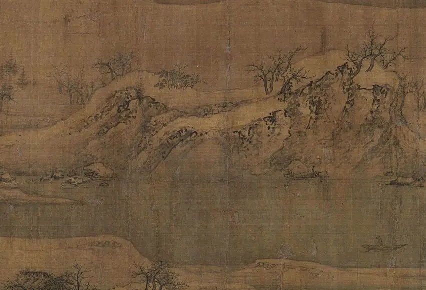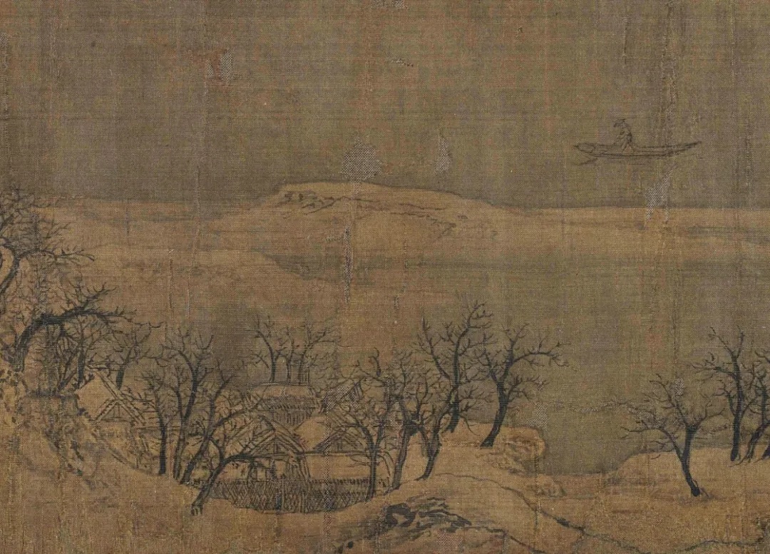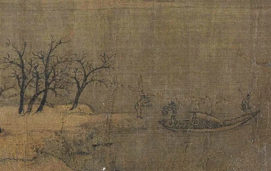 《雪江归棹图》画面起首——远山平缓,进入中段以后——山势渐渐高耸,转而趋于平缓;整幅画面富有高低错落的节奏感,使观者仿佛身临其境。