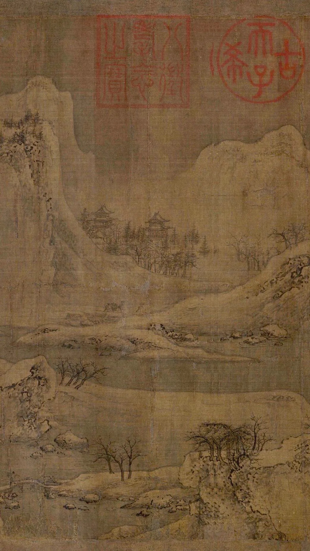 虽说描绘雪江,无论远山逶迤抑或峰峦叠嶂,然全无萧疏严寒之气,乡居、渔村、庙宇、城池,意境宁和。点景建筑、寺院楼阁、渔棚村舍,掩映其间。