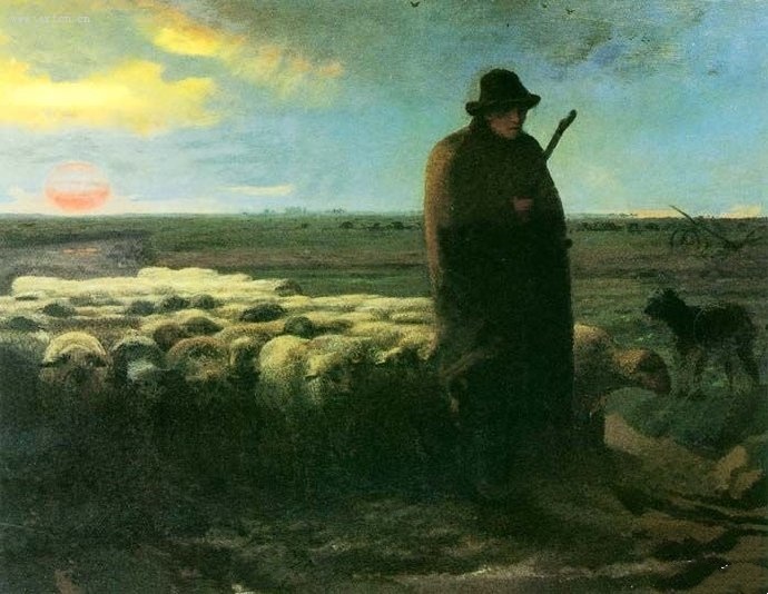 一轮猩红浑圆的落日在吞吃最后的晚霞,暮色中赶羊归来的一个牧羊人静立在广阔的原野上,远方的树木和灌木丛若隐若现着遥远的剪影。天空呈现为一种忧郁的橄榄色,使几只孤独的雀鸟哀鸣的飞翔着,惟有两块椭圆形的云彩正在歌唱它黄金的梦境。牧羊人此刻站在一幅沉思的雕像中,脸部瘦削的神态仿佛在祈祷大地的沉默。他头戴一顶黑色的毡帽,身穿一件褐色的长袍,右手将牧羊的棍子竖在胸前,与自己的肖像和天空橄榄色的背景拼成一个图案。而牧羊人身后那些羊子似乎早已归心似箭,但牧羊人右边一只健壮黑色的牧羊犬却一副若无其事的样子。牧羊犬面对日落呐喊的崩溃和羊群咩咩的叫声,让暮色中赶羊归来的牧羊人的雕像显的高大而又肃穆。