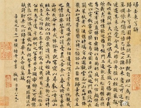 归去来兮!田园将芜胡不归? 既自以心为形役,奚惆怅而独悲? 悟已往之不谏, 知来者之可追; 实迷途其未远, 梵 令是而昨非。舟摇以轻飏, 风飘飘而吹衣。问征夫以前路, 恨晨光之熹微。乃瞻衡宇, 栽欣载奔。童仆欢迎. 稚子 候门。三径就荒,松菊尤存。携幼入室, 有酒盈樽。引壶觞以自酌, 眇庭柯以怡颜。倚南窗以寄傲, 审容膝之易安。 园日涉以成趣,门虽设而常关。策扶老以流想,时翘首而遐观。云无心以出岫,鸟倦飞而知还。景翳翳以将入,俯孤松而盘桓。归去来兮, 且息交以请绝游。世与我而相遗, 复驾言兮焉求? 悦亲戚之情话, 乐琴书以消忧。农人告 余以春, 及将有亊于西畸。或命巾车. 或棹孤舟。既窈窕以寻壑, 亦崎岖而经丘。木欣欣以向荣, 泉涓涓而始流。善 万物之得时, 感吾生之行休。已矣乎! 寓形寓内复几时? 曷不委心任去留? 胡为乎惶兮欲何之? 富贵非吾愿, 帝乡 不可期。怀良辰以孤往, 或执仗而耘耔。登东皋以舒啸, 临清流而赋诗。聊乘化以归尽, 乐夫天命复美疑? 辛亥九月十一日横塘舟中书徵明时年八十又二