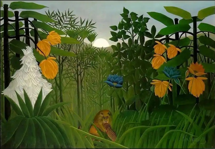 此作品以其独特的视角与奇幻的想象,呈现出令人惊叹的画面。画中狮子就餐场景神秘又新奇,展现出卢梭对自然生灵别样的艺术诠释。