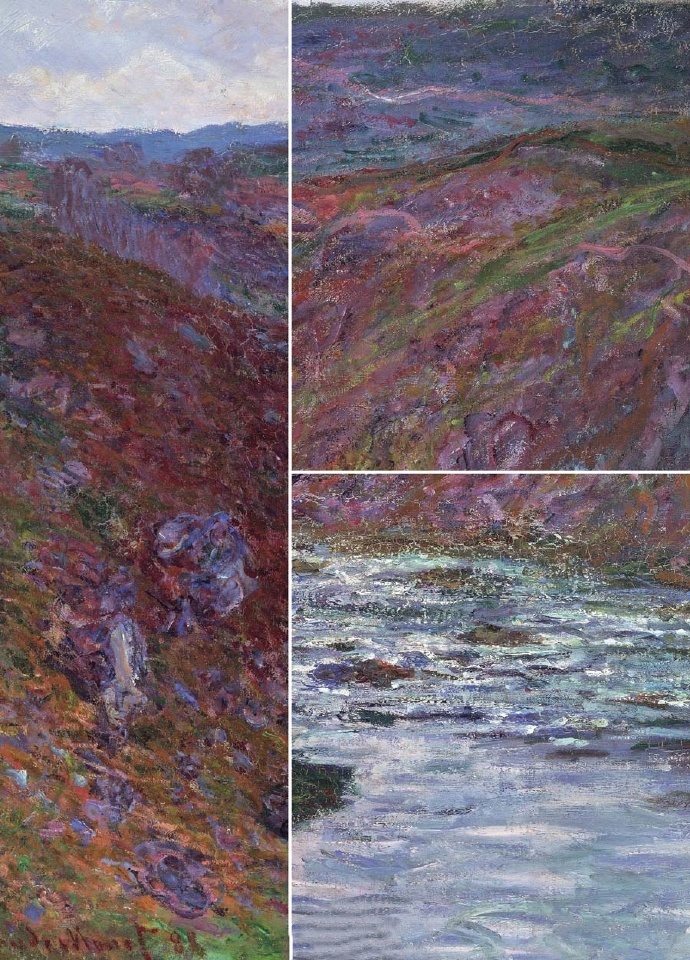在这幅作品中,莫奈使用了极度简化的构图和对象造型方式,红色和绿色的对比使得山谷风景显得色泽异常浓烈,给人以厚重的印象,峡谷的河水使用强调流动感的笔触,高亮的波浪反光提升了画面整体的亮度和饱和度,而且近处阳光下的山谷和阴影中的山谷部分明暗对比强烈,让画面整体具有一种粉彩效果。