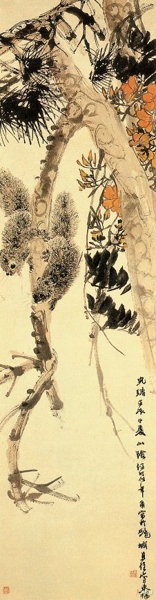 <凌霄松鼠图> 清 任颐 纸本设色 纵163.5 X横46.5厘米 南京博物院藏