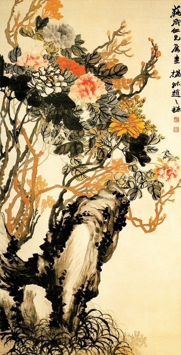 赵之谦(1829-1884),浙江绍兴人。 擅篆刻、书画。传世作品有《牡丹图》、 《花卉图》、《菊花图》等。此图以秀石、 牡丹入画,其敷色用笔反映了作者的 独特风格。 牡丹的描绘兼用没骨、勾线填色二法,并将其统一在凝重沉厚的笔法之中,敷以红、黑、绿等重色,在对比中求协调,使画面浓丽热烈,雅俗共赏。