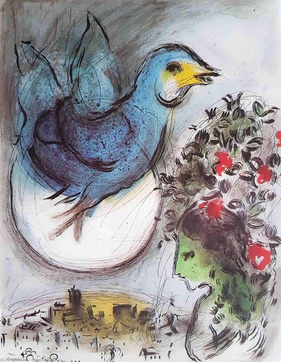 夏加尔始终以童真视角捕捉生命中的美好与希望,将蓝鸟等意象赋予自由、丰饶与新生的寓意,用斑斓色彩与奇幻构图打破现实边界,把日常场景升华为充满情感温度的精神表达,传递对生命本真的热爱。