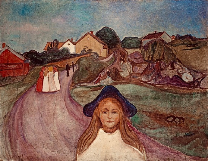 这幅画是爱德华·蒙克于一九〇三年创作的奥斯加斯特兰德的街道。画面描绘挪威海边小镇的一条斜坡街道,前景是一位戴帽女子的孤独身影,远处房屋、树木与人物在流动的线条中轻微扭曲,色彩鲜明而带着不安的震动感。蒙克多年夏天在此居住,因此画作既具真实景象,也浸透他对这个地方的私人情绪。