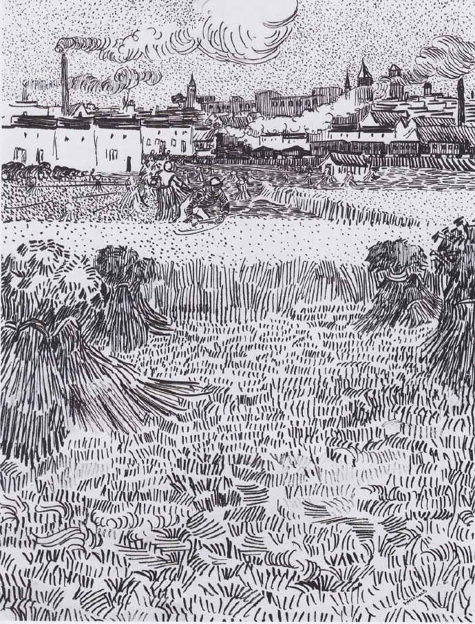 这幅画是文森特·梵高于,一八八八年六月创作收获的钢笔素描版本。画面描绘阿尔勒周围广阔而平坦的乡间景色,前景是成捆的麦束与正在劳作的农民,背景则延伸至房屋、树木和远处城镇的轮廓。线条干净而坚决,使夏日的炙热与土地的节奏跃然纸上。