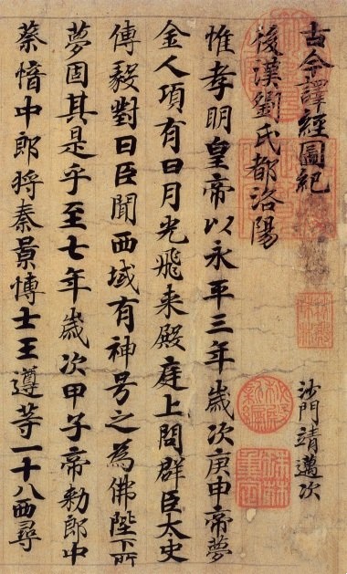 惟孝明皇帝,以永平三年岁次庚申,帝梦金人,项有曰月光飞来殿庭。上问群臣,太史傅毅对曰:“ 臣闻西域有神,号之为佛,陛下所梦,固其是乎! ” 至七年,岁次甲子,帝 敕郎中蔡愔、中郎将秦景、博士王遵等一十八人,西寻