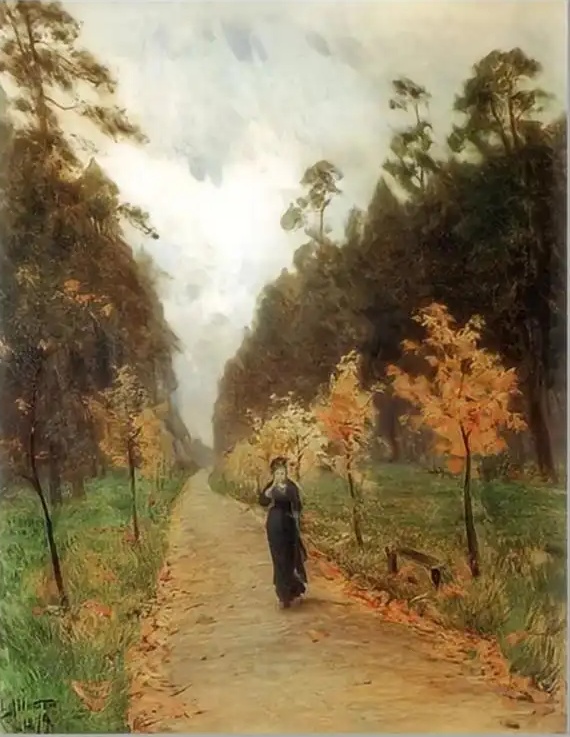 画面为深秋,一清瘦、面有菜色的黑衣女子低头独行。乱云飞渡,草木摇曳,落叶残败,满目萧然,映衬出人物内心的孤独与惆怅。这幅画正是文中提到的他十八岁时被收藏家特列加科夫出重金买去的那幅毕业作品,也是他的处女作。关于画意解释不确,倾向的说法是描述一篇契科夫小说中的人物场景。特列加科夫是巡展画派的坚定支持者,他通过买入他们的作品对画家提供资金帮助。