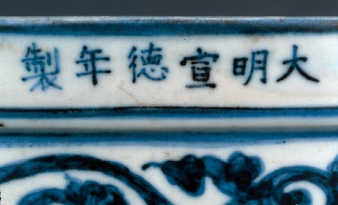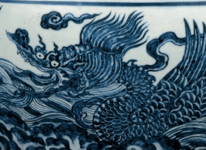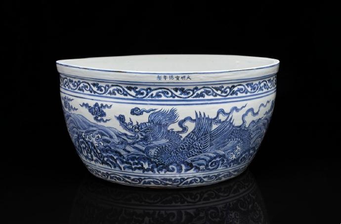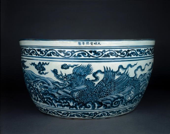 此缸器形壯碩,裝飾華麗,以青花繪兩條龍飛躍于洶湧的波濤之間。龍有翼、長鼻、張口。厚口沿裝飾一周卷草紋,署六字宣德年款。內部施釉。景德鎮珠山曾出土類似的宣德時期魚缸,器形還要略大一些。皇帝訂燒這些魚缸或用於養魚,或種植水草,放置於宮殿內或宮廷花園之中。陶工們在技術上很難保證這類器物在燒造過程中不產生扭曲變形,因此留存至今者極少。