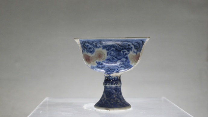 御窑厂景德镇御窑博物馆陈列# 永乐青花釉里红海浪三鱼纹高足杯 高7.2厘米 口径8厘米 底径3.9厘米
