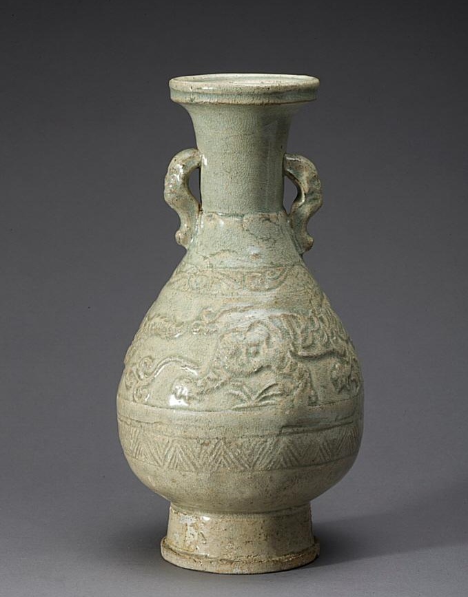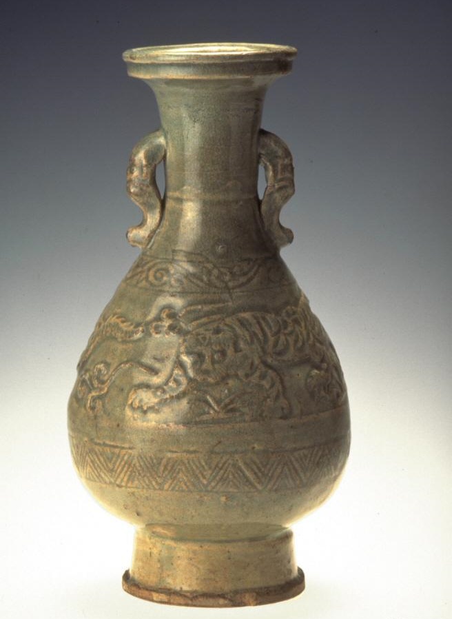元代景德镇龙虎纹衔环青瓷瓶一对