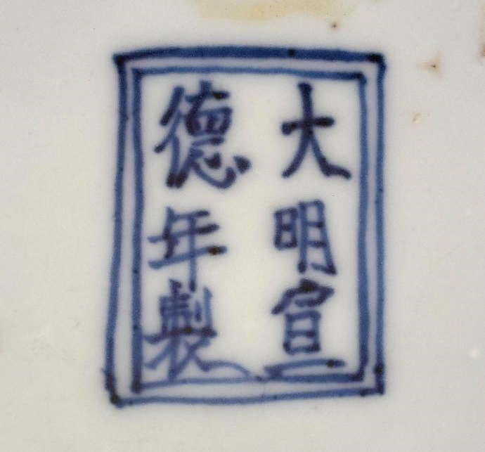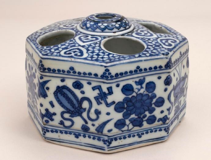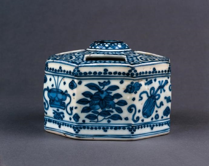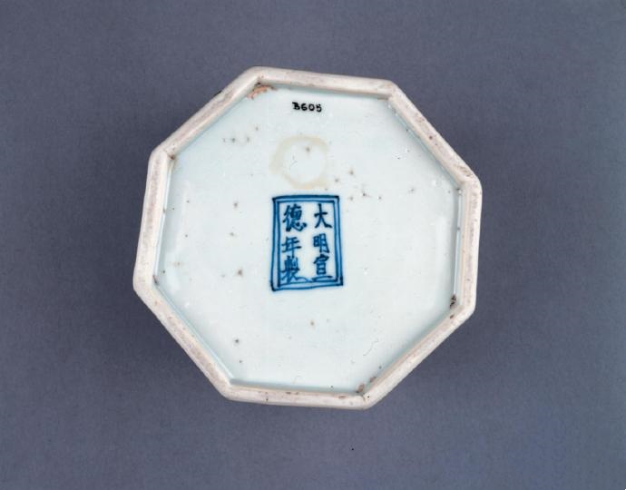 本件八方形器物為插瓷墨件或瓷筆管所用,周圍裝飾以青花祥瑞符號、樂器、折枝花果。外底署青花六字宣德寄托年款。