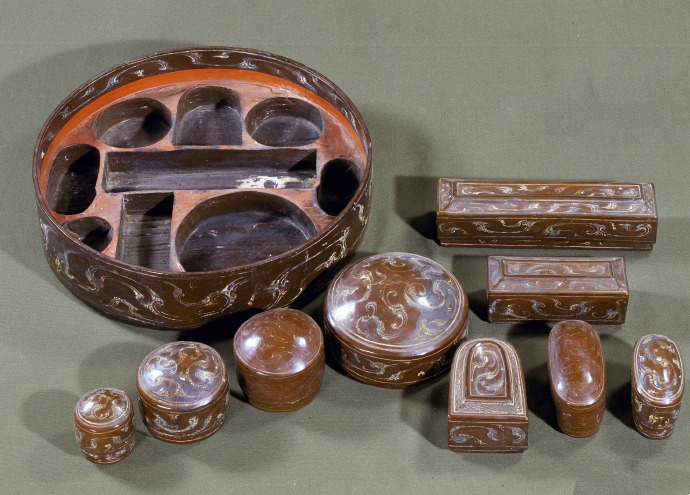 梳妆奁。专门放置梳妆用具的器物。器身分上下两层,连同器盖共三部分。盖和器身为夹纻胎,双层底为斫木胎,器表涂黑褐色漆,再在漆上贴金箔。金箔上施油彩绘。盖顶、周边和上下层的外壁、口沿内以及盖内和上层中间隔板上下两面的中心部分均以金、白、红三色油彩绘云气纹。其余部分涂红漆。上层放置手套三双,丝绵絮巾、组带、绢地“长寿绣”镜衣各一件。下层底板厚5厘米,凿凹槽9个,槽内放置9个小奁,内放化妆品、胭脂、丝绵粉扑、梳、篦、针衣等。