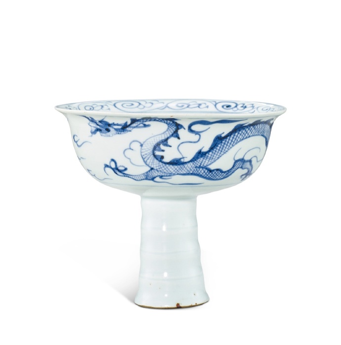 相类元代高足杯见于重要公私收藏。北京故宫博物院藏一例,收录于《故宫博物院藏文物珍品全集:青花釉里红(上)》,上海,2000年,图版12;大英博物馆亦藏一例(馆藏编号:1975,1028.4);另见两例,分别为 Otto Harriman 夫人及 英国 Cunliffe 肯里夫勋爵旧藏,展览并收录于《Chinese Blue and White Porcelain: 14th to 19th Centuries》,东方陶瓷学会,伦敦,1953-4年,编号11及12。拍卖类例可参考琼肯三世旧藏一例,先售于香港佳士得1993年10月25日,编号718,再售于香港苏富比2019年4月3日,编号106。另一例经帕默、徐氏艺术馆及玫茵堂递藏,一度售于香港苏富比2012年10月9号,编号17,后入藏十面灵璧山居。