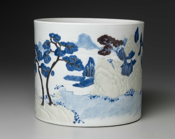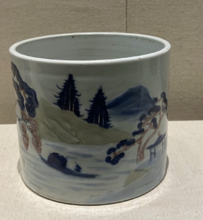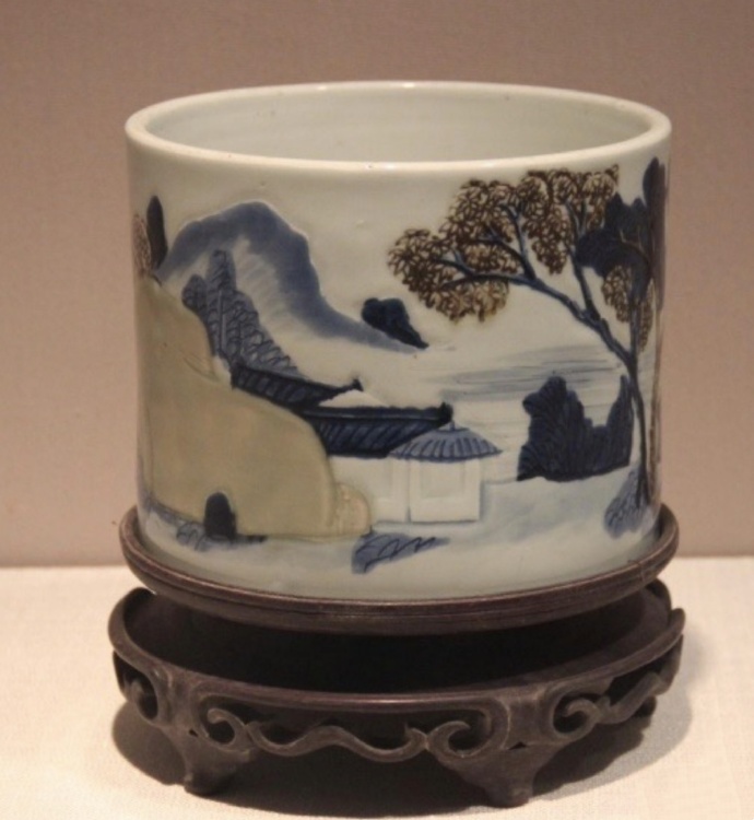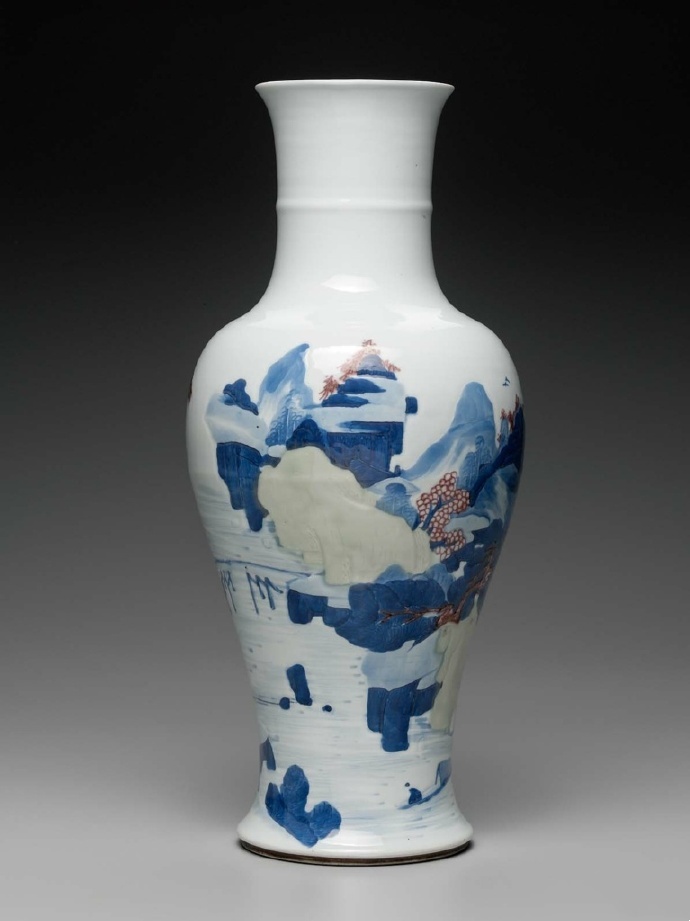 波士顿居然有三个,釉下三彩是康熙朝新创烧的高温釉下彩品种,它以青花、釉里红和豆青釉三种釉下彩相结合,国博也称为釉里三色,三种颜色均发色纯正鲜艳,其烧造要比青花或釉里红难度更大,故为名贵的釉下彩瓷品种。常见以青花、釉里红、豆青三色绘山水图,远山近水、亭阁屋舍、苍松古柏等,用刻划、加彩等装饰技法描绘。