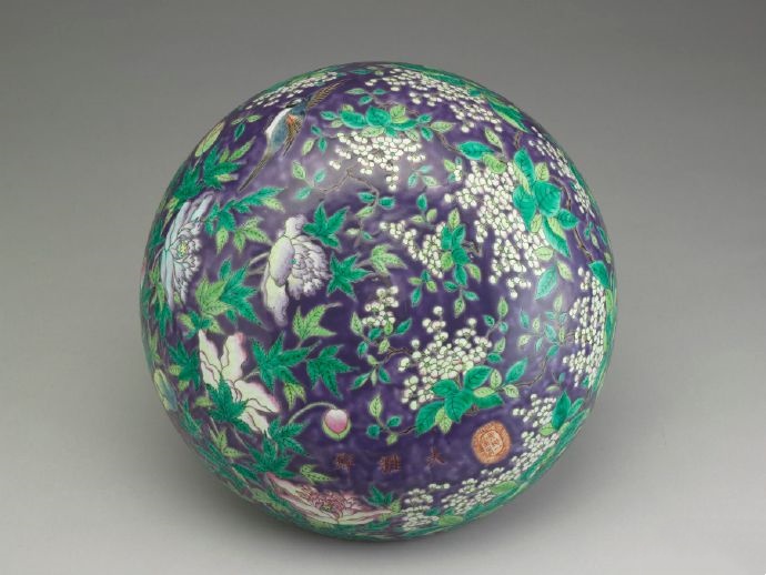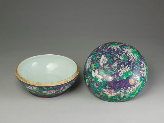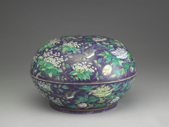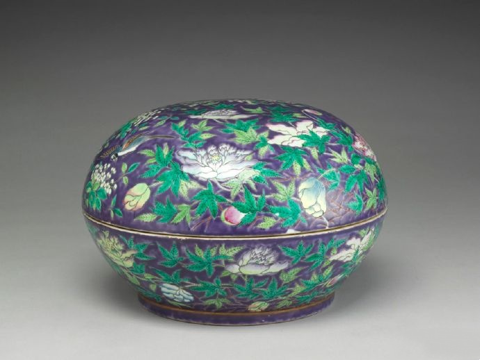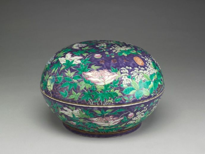 清 同治 紫地粉彩花鳥盒