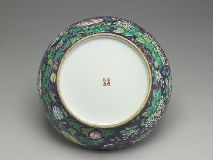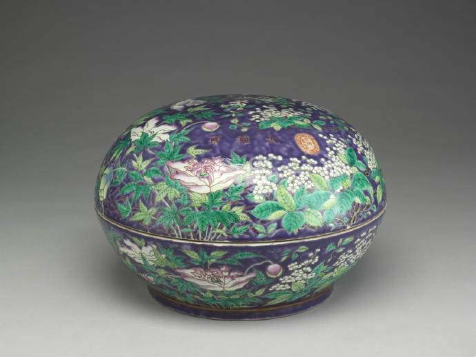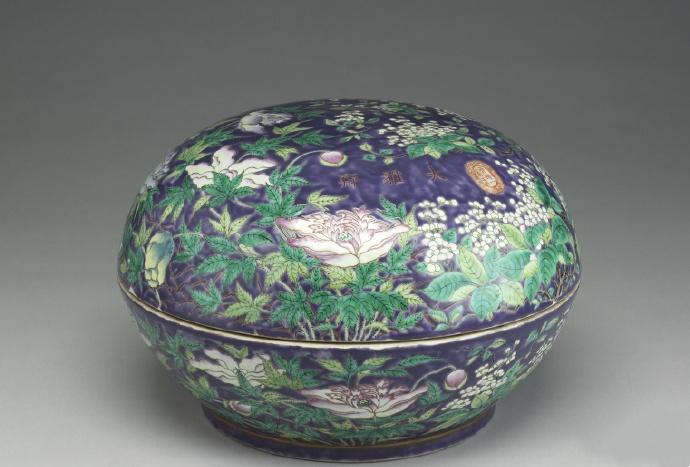 大型圓捧盒,圓拱蓋、子母口、平底、矮圈足,全器厚重。外壁滿飾低溫釉彩,以藍紫色為地,粉彩各色牡丹、芙蓉、繡球花,花葉怒張,而紅、黃、綠彩深淺並呈,繽紛熱鬧;蓋及器各飾一鵲鳥飛翔花間。紫色暈染不勻,但百花枝葉繁茂、全無間隙,呈現盎然生機的裝飾美感。蓋面橫書有紅色楷書一行「大雅齋」三字,右側一篆書硃紅雙龍印記:「天地一家春」;器底朱書「永慶長春」二行楷款。「大雅齋」為清末慈禧太后用器的款識,從同治到光緒年間,製作的種類繁多,喜愛翠綠、艷紫或胭脂紅的低溫彩,器面熱鬧,但釉彩易剝落。国内北京【御堂佳器】陶瓷文化机构之奚文骏学者做展览和图录有相关研究,可以查阅。