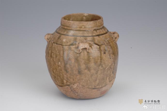 直口鼓腹,平底内凹。肩部上、中、下各饰一周弦纹,肩上对称横置四个桥形系。周身布满方格纹,施褐釉不及底。该罐具有东汉瓷器的典型特征,是早期青瓷的代表作品。 石门矶窑位于今长沙市望城区长沙窑窑区瓦渣坪以南的湘江河滩边,1987年发现。该窑址出土青(酱)瓷罐、碗、盆、钵和陶质豆、釜、烛插等。其中青釉方格纹四钮罐与《长沙西晋南朝墓发掘报告》中西晋墓出土的罐相类似,青釉凸沿碗也与江西南昌西晋晚期墓出土的凸沿大平底碗相类似,说明该窑的相对年代大致相当于汉末三国至西晋之际。 参考文献: ①周世荣.湖湘陶瓷[M].湖南美术出版社,2008年