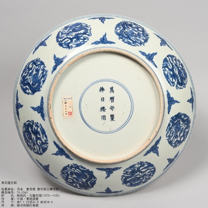 该盘底部款识书有“万历年制 捧日楼用”八字双行楷书款,属万历朝首辅张居正居所专用器。款识罕见,极为特别。香港怀海堂亦藏同款瓷盘。