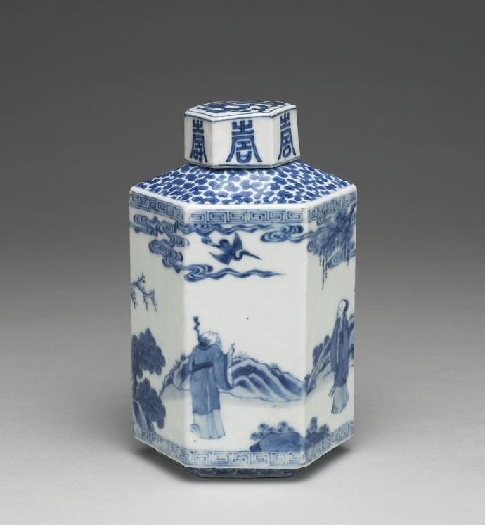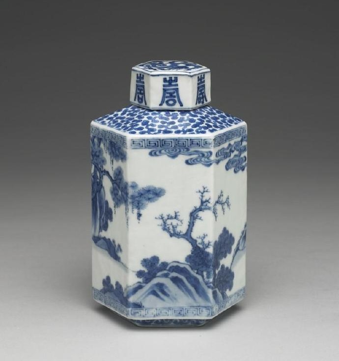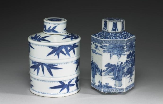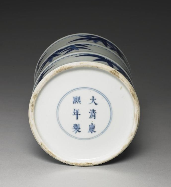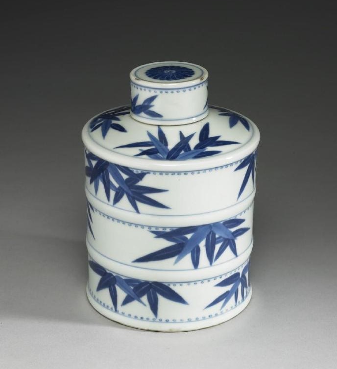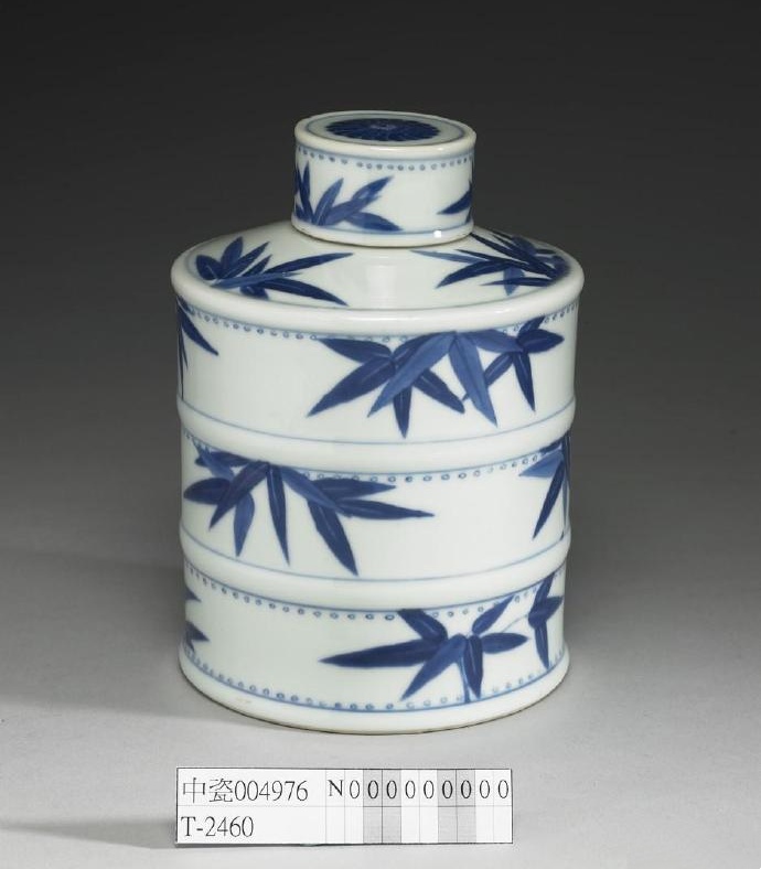小口,短頸,斜肩,直腹,肩腹間凸棱三道呈三段竹節形,平底,凹足,帶圓狀瓶頂蓋。全器均施白釉,外壁以青花繪竹葉,肩至底共四層竹節,節與節之間各加飾小圈點一周,象徵竹節的凸點。蓋面飾花卉圖案,蓋壁紋飾與器同。器底青花書「大清康熙年製」六字二行楷款,外加雙青圈。此類型蓋罐為貯藏茶葉的茶葉罐,除青花外亦有鬥彩器,以青花鉤竹葉輪廓,高溫燒成後再施綠彩低溫燒成,相當雅緻。