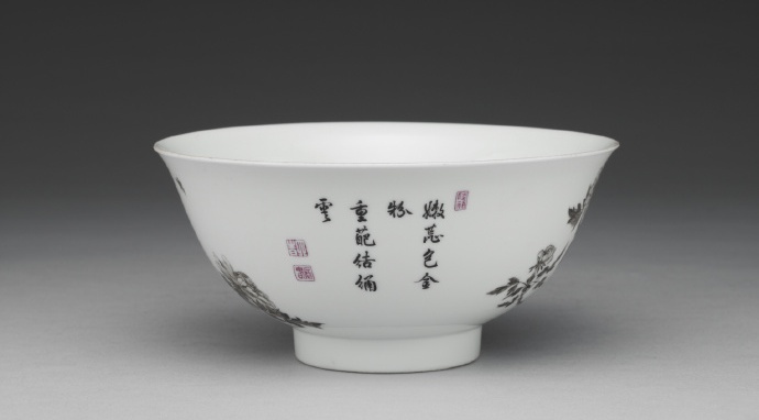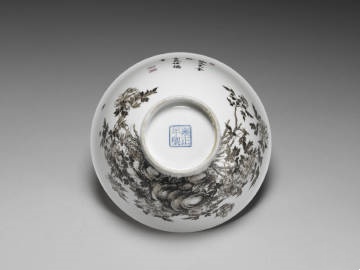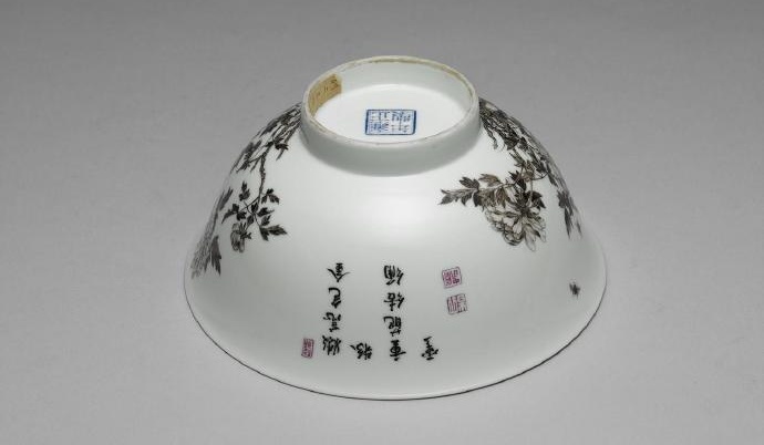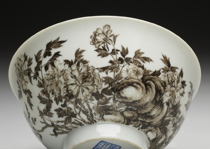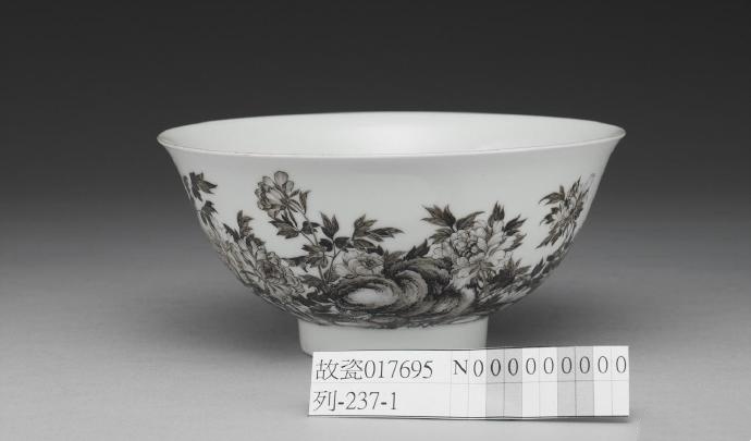 說明: 碗侈口,弧形深壁,平底,淺圈足,器內外施白釉。器壁一面以赭墨繪牡丹花葉,間置石塊與兩隻昆蟲,所畫花瓣無論盛開或含苞,皆有輪廓勾邊,在花瓣翻轉處、接近花蕊處或花托部分皆以較深的墨色表現,營造立體感;葉子在葉片翻轉處亦有深淺墨色表現,因此花與葉彷彿受風吹拂而搖曳生姿;花枝部分則以沒骨畫之;石頭除以輪廓寫形外,在石塊邊緣點上苔點,於石塊的面上再畫數道淺色線條製造仿如畫家畫石的皴法,石塊交接處也以墨色加深陰影效果,因此,石塊的質感與光線陰影的立體效果便藉由墨色的使用與繪畫技巧而呈現。器壁另一面墨書題句:「嫩蕊包金粉,重葩結繡雲」,二句改自唐代詩人韓琮《詠牡丹未開者》詩「嫩蕊包金粉,重葩結繡囊」。詩首、詩尾有紅料描書篆體朱文「佳麗」、白文「四時」、朱文「長春」三印。圈足露胎,底有「雍正年製」兩行宋體款,外加雙方框。