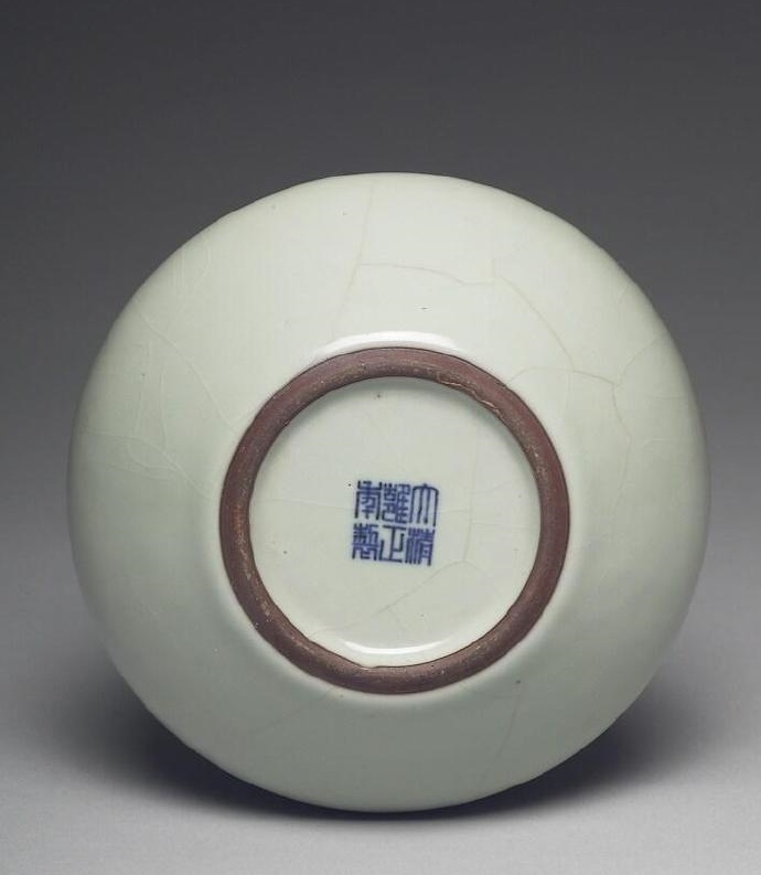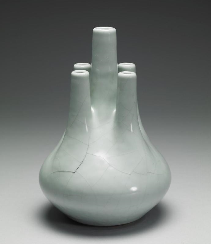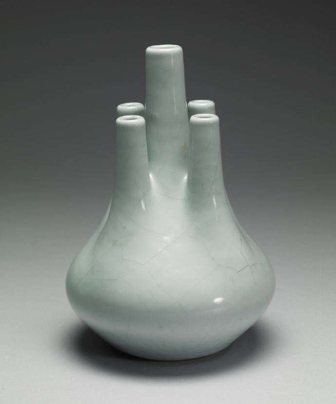 說明: 五管花插,中者較高大,各作圓口,直長頸,下接垂腹,內體相通,平底,淺圈足。通體施汝釉,色灰青,帶透明開片紋,釉面有舊傷裂。圈足露胎,塗棕色汁仿銅足,底心篆書「大清雍正年製」六字三行青花款。