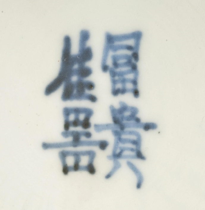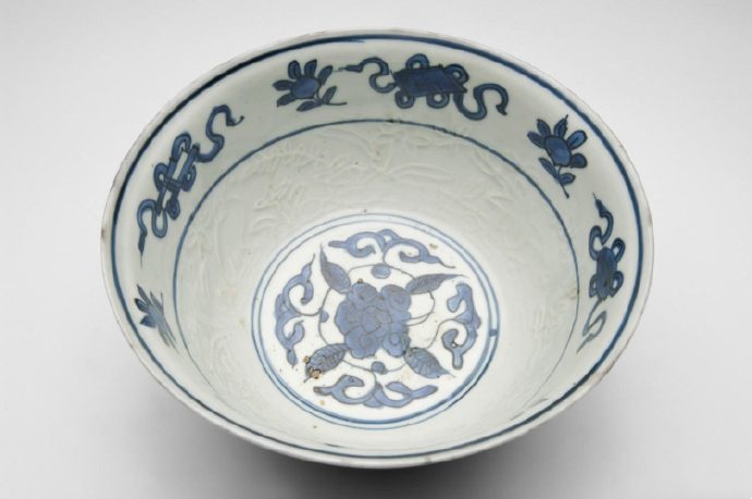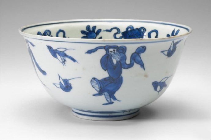 明嘉靖青花 人物碗 ,内有模印 这是东方朔偷桃吗?东方朔有点骷髅头了,