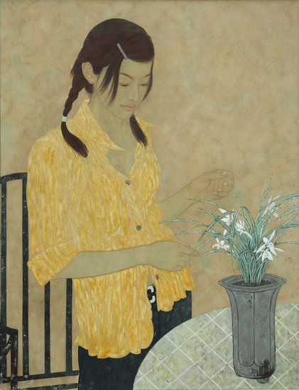湖南画家雷家林擅长画女人体,且将自己的系列女人体作品冠以“女人花”之名,他所画的女人是与花、花瓶、花瓣相融相衬托,这种彩墨画,自然、清新、简洁,女人在花的衬映下显得格外娴静,甚至略显慵懒,反映出她们内心的宁静与生活的知足感。欣赏者在观赏雷家林的这些作品时,被这种简洁的技法删去了复杂的念想,人们受到女主人公的情绪感染,并产生圣洁感。