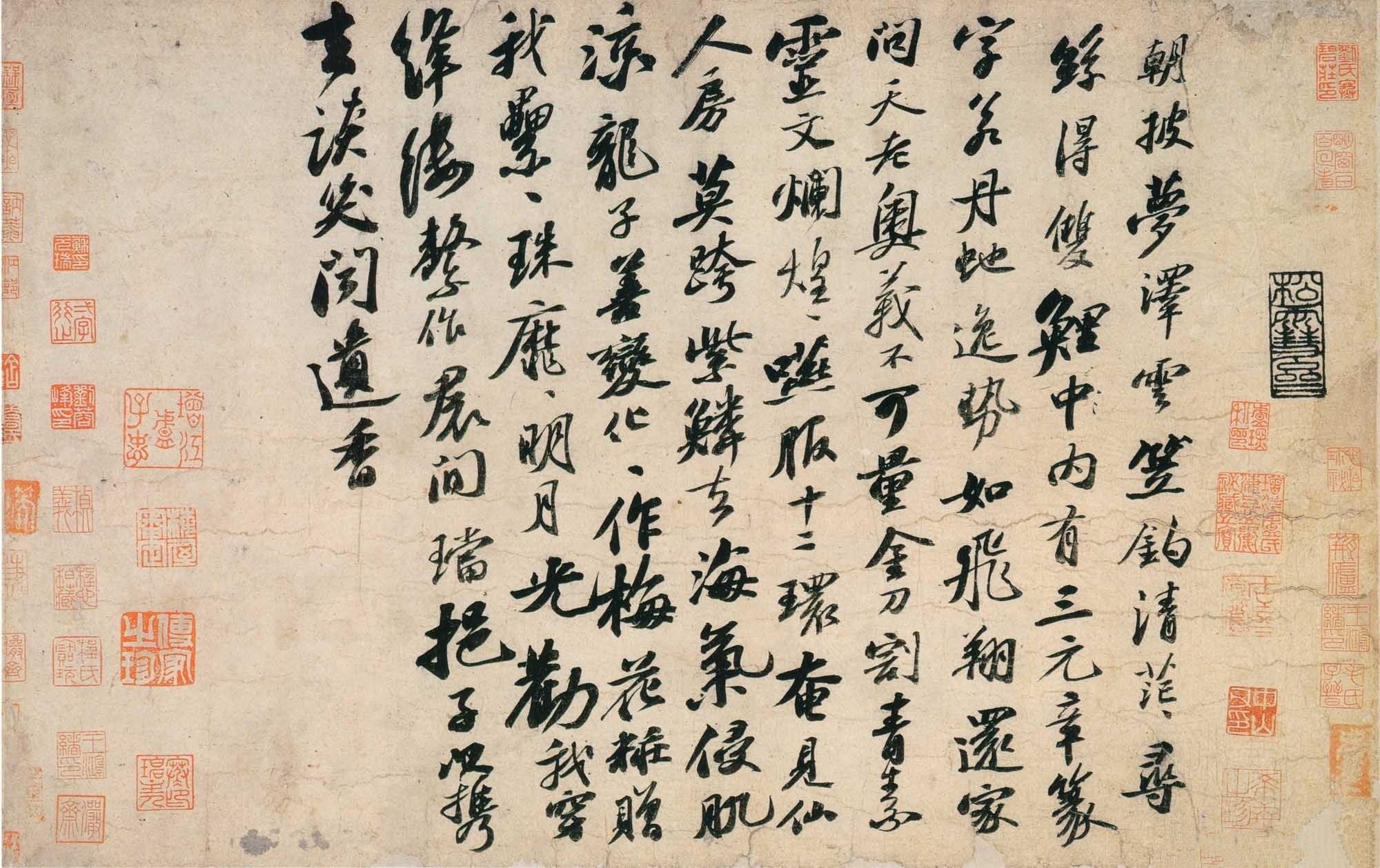 苏轼(1037—1101)宋代著名书法家,中国书法史上“宋四家”之首。此行书《李太白仙诗卷》,为苏轼五十八岁,即北宋元祐八年(1093)所书,清人高士奇《江村销夏录》著录。此帖已于清末流入日本。北宋施宜生谓“颂太白此语。则人间无诗,观东坡此笔,则人间无字。”此两诗为游仙诗,《李太白文集》所不载。太白此诗共两首,第一首娓娓道来,仙气拂面,引人入胜;第二首凄清空逸,超脱人寰。苏东坡此书,第一首灵秀清妍,姿致翩翩,后十句渐入奇境,变化多端,神妙莫测。第二首驰骋纵逸,纯以神行人书合一,仙气飘渺,心随书走,非复人间之世矣。此书境界,今人实难企及。