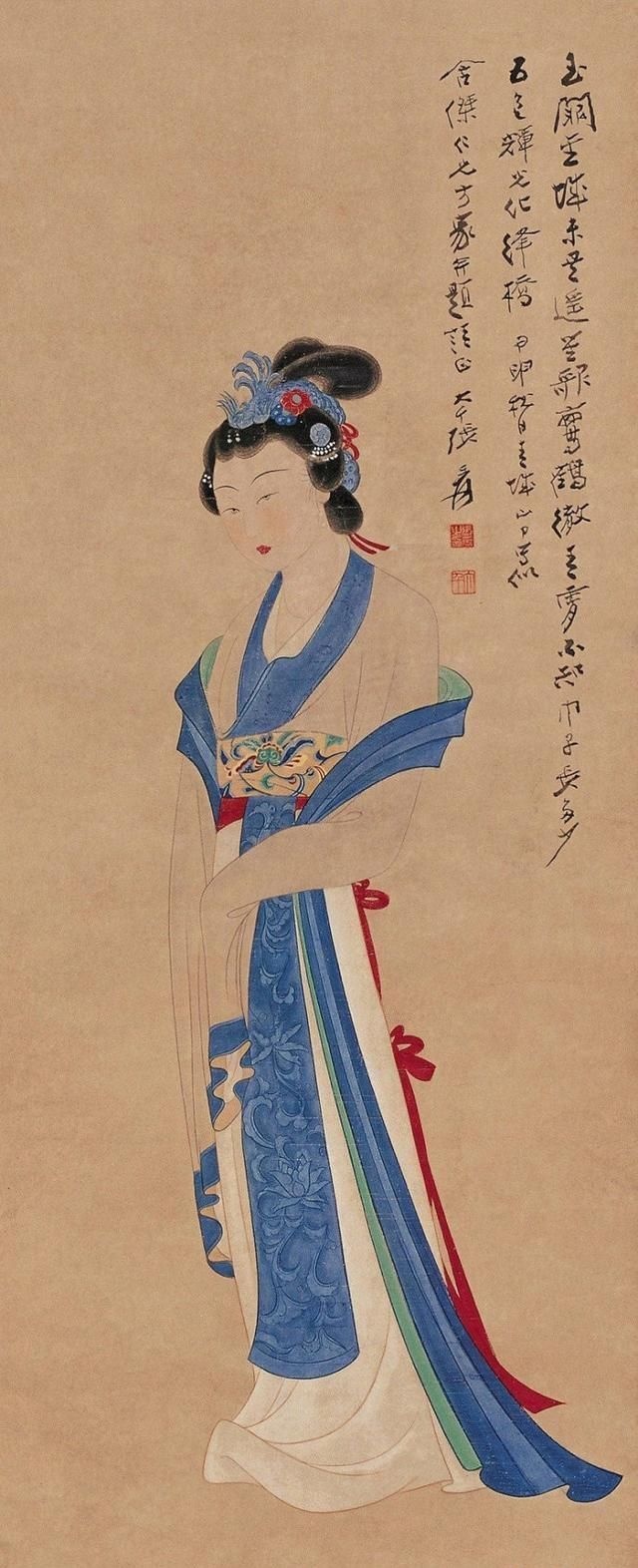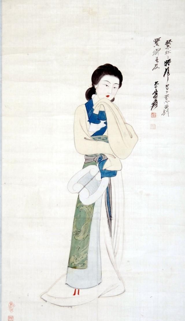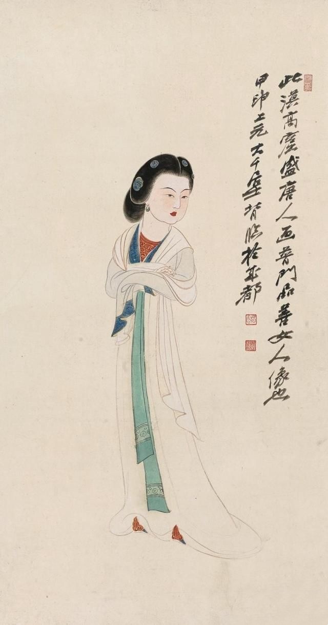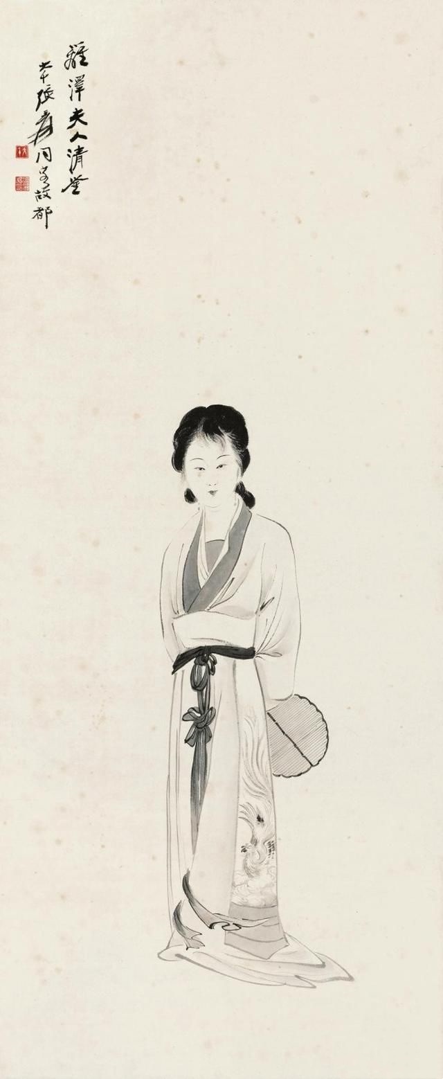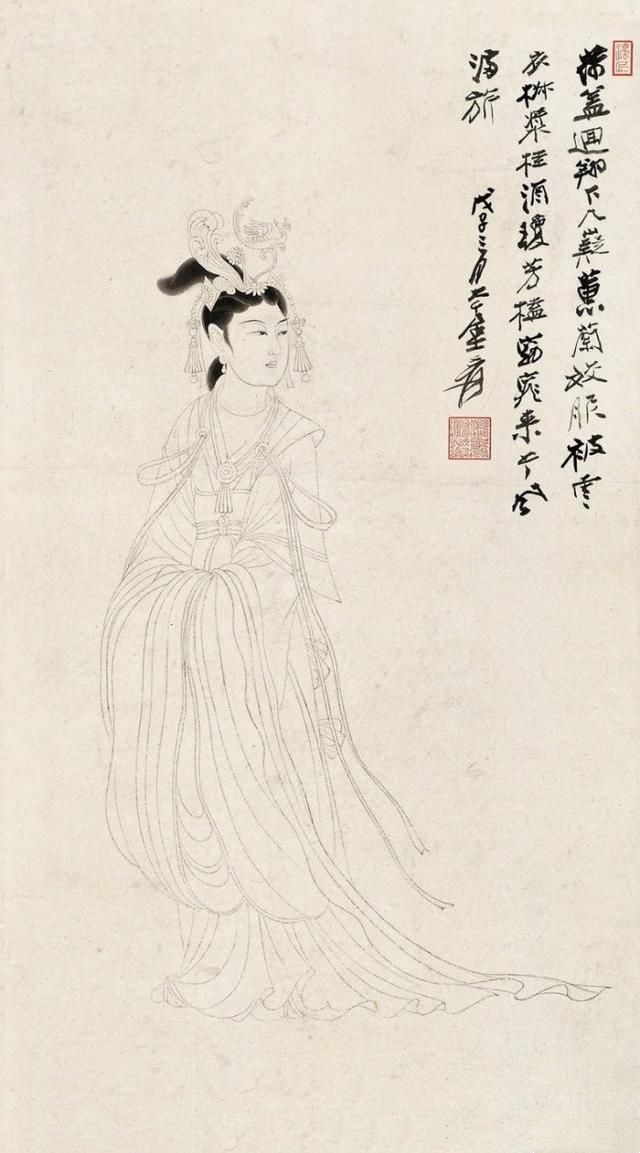 在张大千(1898—1983)的人物画里,多以画女性居多,一个重要原因是张大千认为“男人不如女人美,不如女人入画”。在他看来,这世上够得上“奇”的男人实在太少,所以他有“眼中恨少奇男子,腕底偏多美妇人”之句。他善于画美人,也懂得欣赏美人,在他的笔下既有优雅的少妇,风华绝代的仙女,也有受了惊吓的贵妃,各种类型、各种情绪美人的风情,都被他刻画得细致入微。张大千选择美人作为自己的主要描摹对象,也是为了继承和发扬中国人物画传统。当年书画大师叶恭绰曾对张大千说,“人物画一脉,自吴道子、李公麟后已成绝响,仇实父失之软媚、陈老莲失之诡谲,有清三百年,更无一人焉 ”,力劝他放弃花卉山水,专攻人物。张大千之所以西去敦煌临摹魏、隋、唐、宋各代壁画,想必与朋友的建议和个人的追求不无关系。
