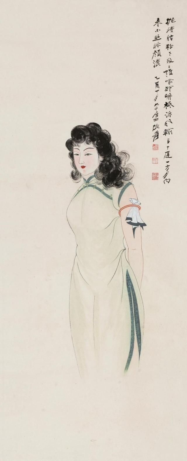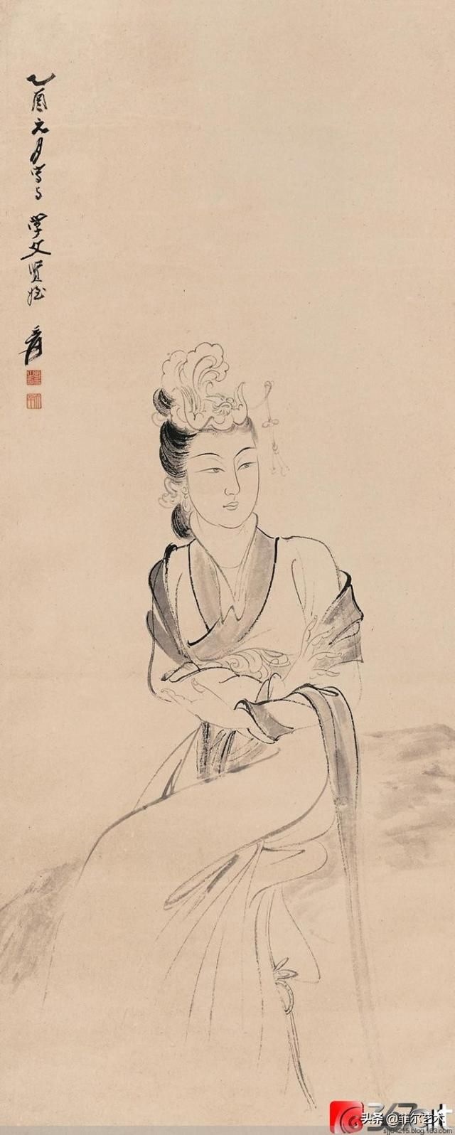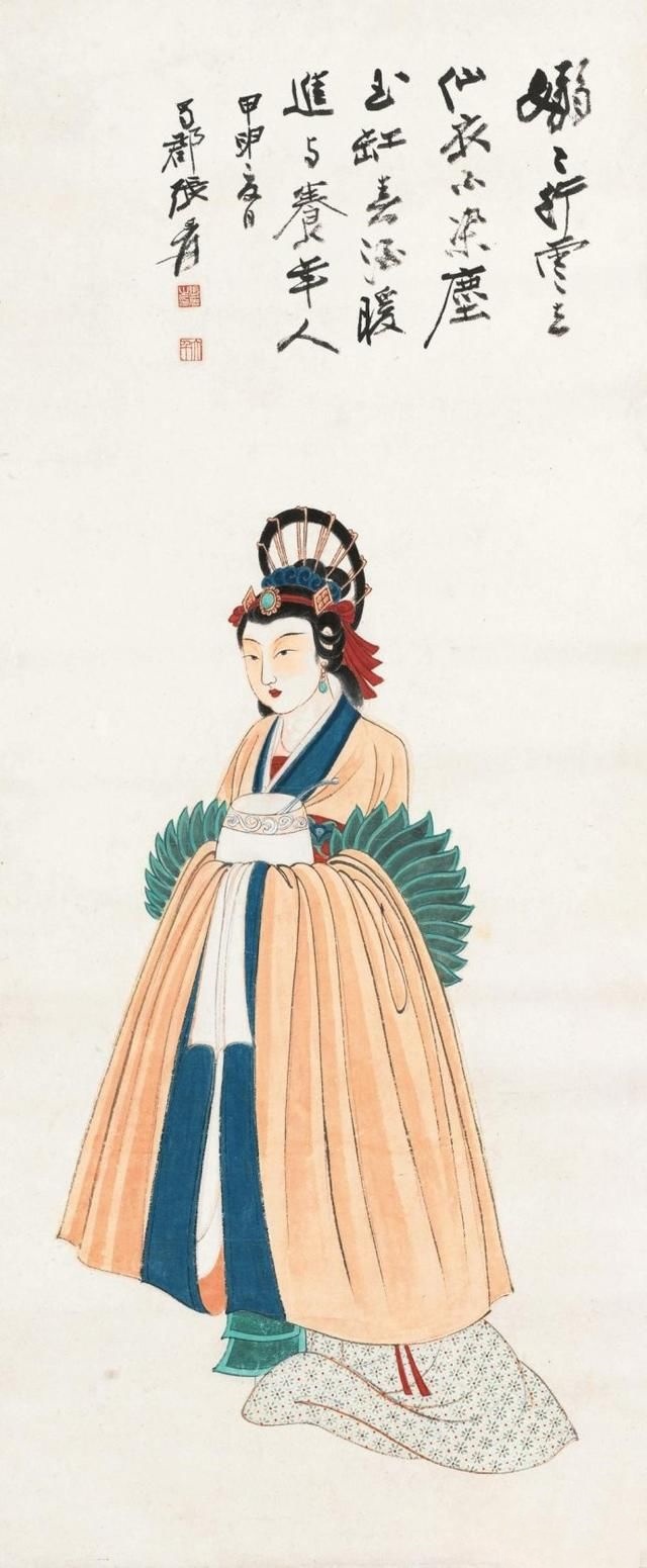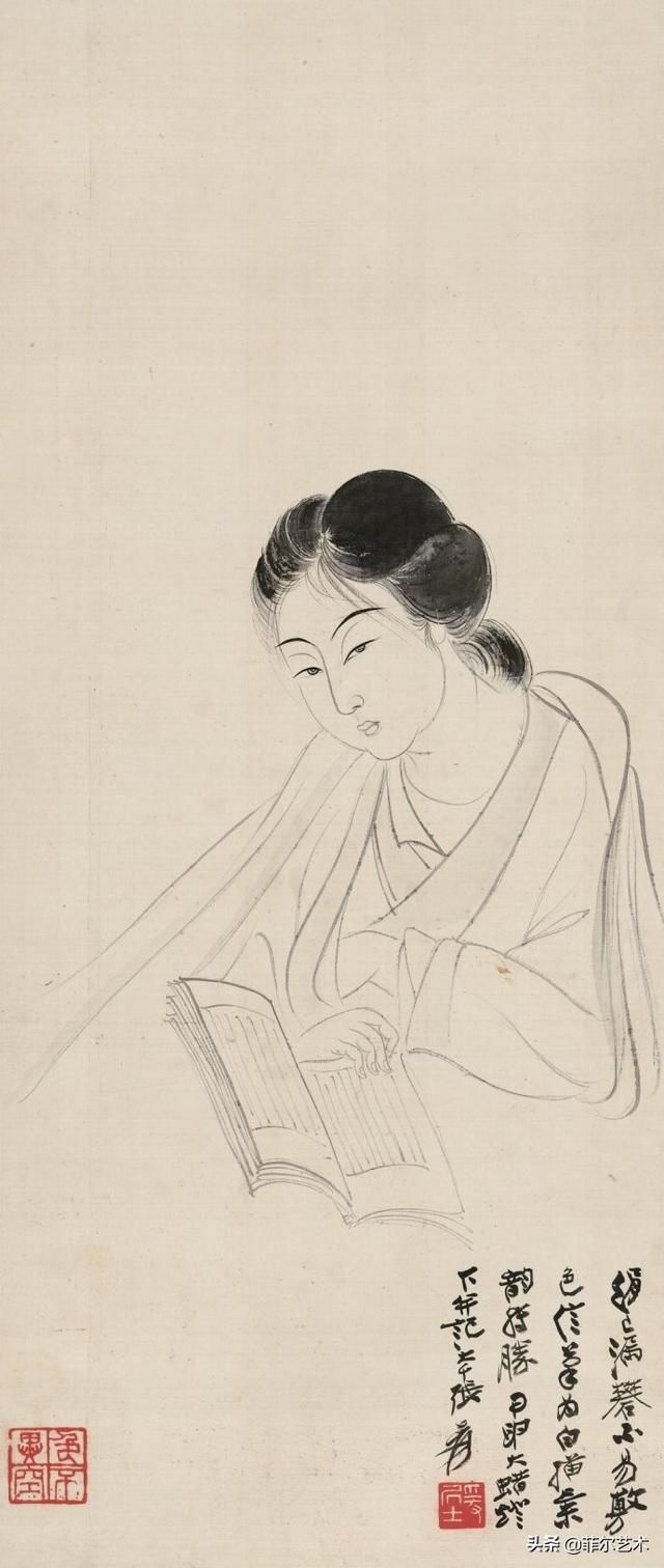 在张大千(1898—1983)的人物画里,多以画女性居多,一个重要原因是张大千认为“男人不如女人美,不如女人入画”。在他看来,这世上够得上“奇”的男人实在太少,所以他有“眼中恨少奇男子,腕底偏多美妇人”之句。他善于画美人,也懂得欣赏美人,在他的笔下既有优雅的少妇,风华绝代的仙女,也有受了惊吓的贵妃,各种类型、各种情绪美人的风情,都被他刻画得细致入微。张大千选择美人作为自己的主要描摹对象,也是为了继承和发扬中国人物画传统。当年书画大师叶恭绰曾对张大千说,“人物画一脉,自吴道子、李公麟后已成绝响,仇实父失之软媚、陈老莲失之诡谲,有清三百年,更无一人焉 ”,力劝他放弃花卉山水,专攻人物。张大千之所以西去敦煌临摹魏、隋、唐、宋各代壁画,想必与朋友的建议和个人的追求不无关系。